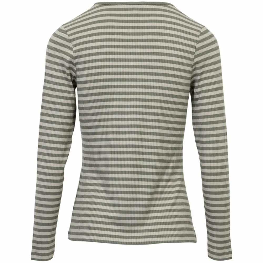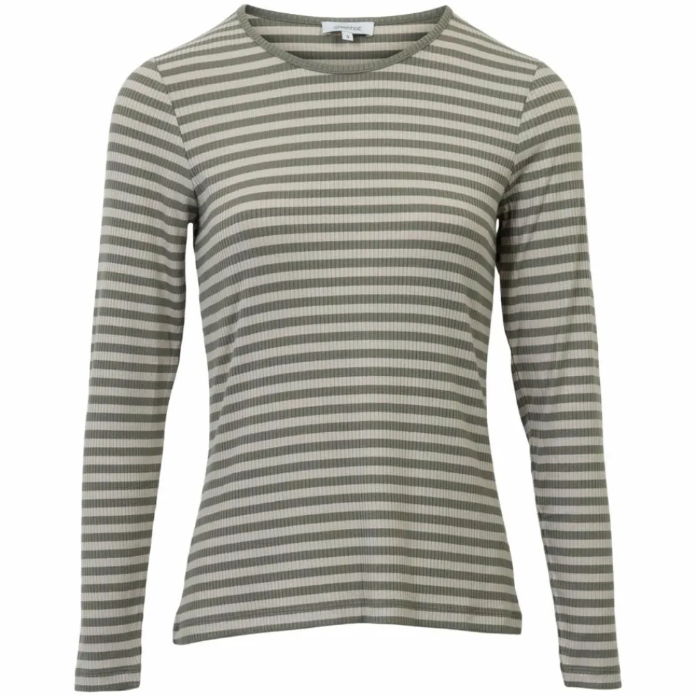 Denne ribbede top i vetiver med fine, lyse striber føles let og behagelig mod huden. Den runde hals og de lange ærmer giver en tidløs form, mens den slanke pasform følger kroppen uden at stramme. Materialet i 94% viskose og 6% elastan giver smidig bevægelse og et pænt fald.