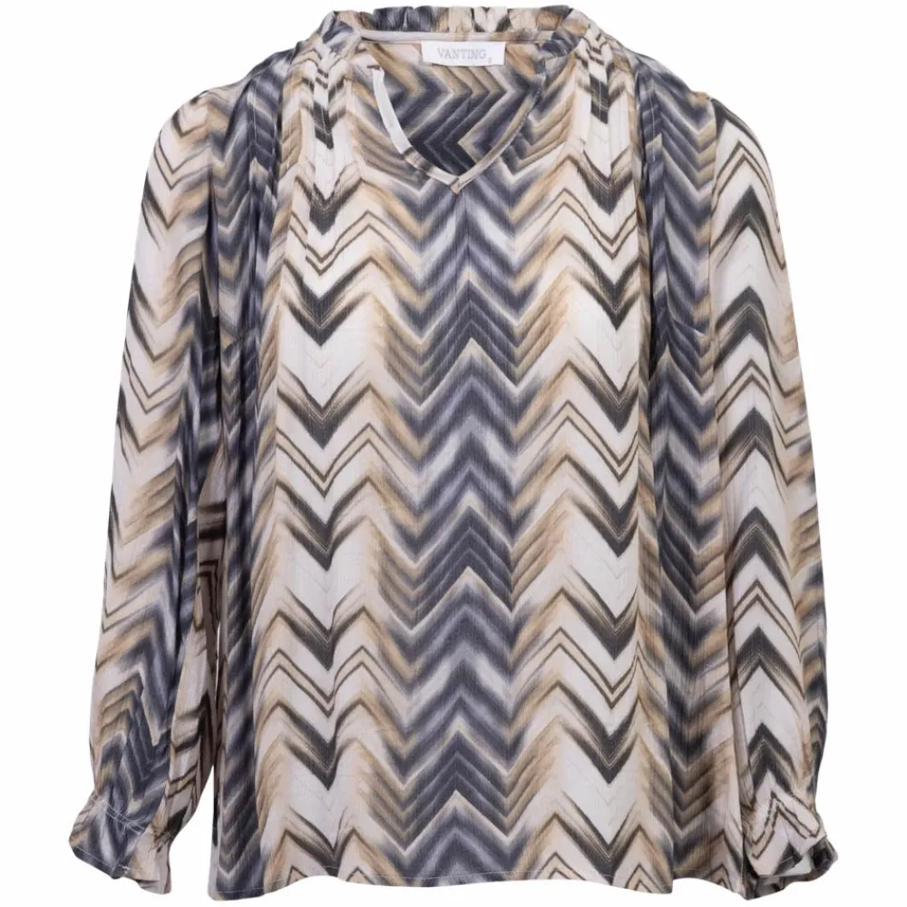 Vanting bluse med all-over print. Blusen har flæsedetaljer ved kraven, samt ned langs brystet. Blusen har elastik i ærmerne, som skaber et poset look.