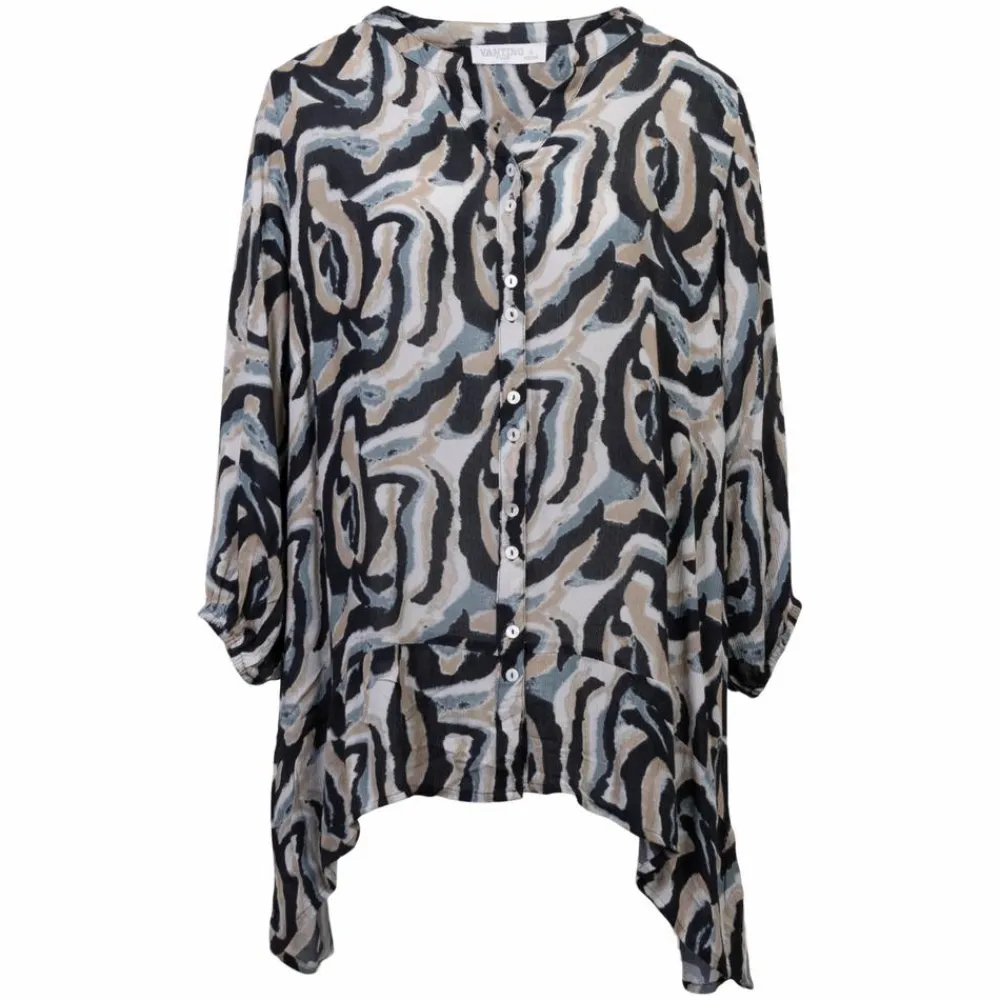 Vanting bluse med all-over print. Blusen er i blødt og luftigt materiale, med knappelukning ned langs trøjen. Blusen har 3/4 ærmer, med elastik forneden, som skaber et poset look. Blusen har flæsedetaljer i bunden af trøjen.