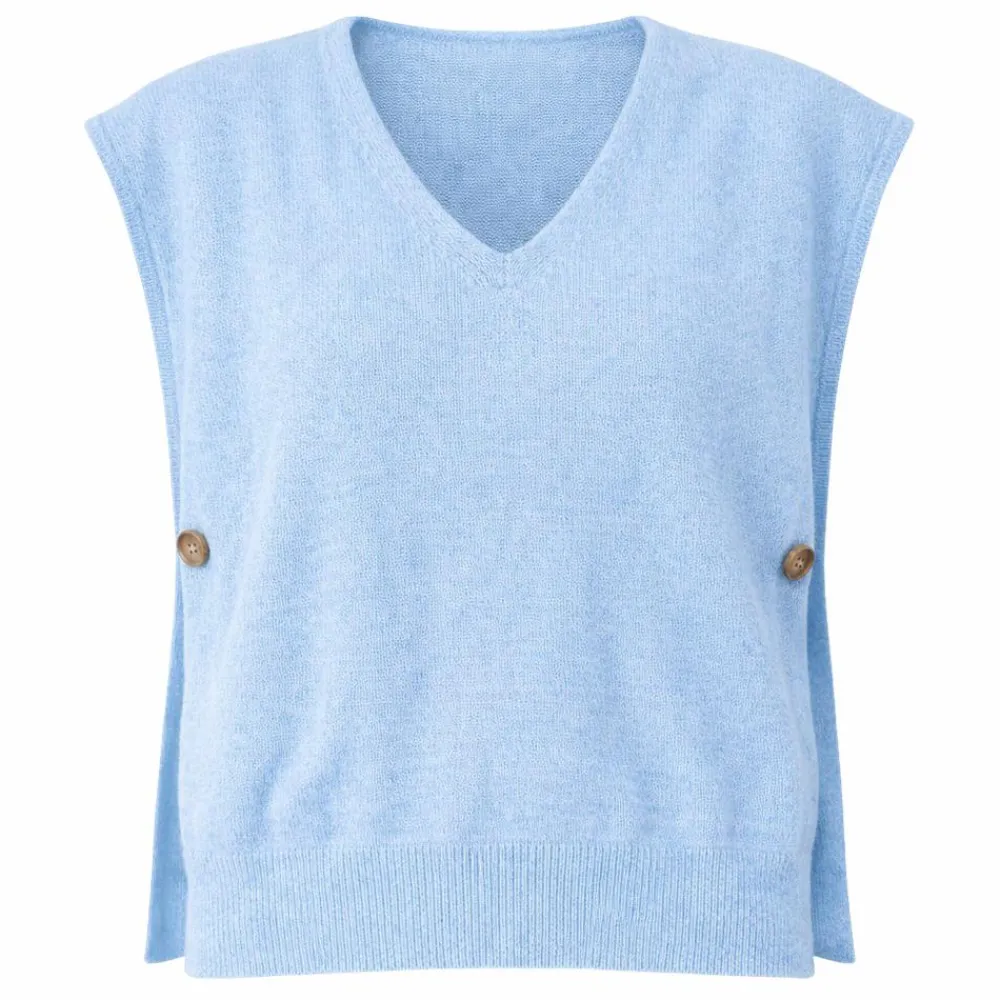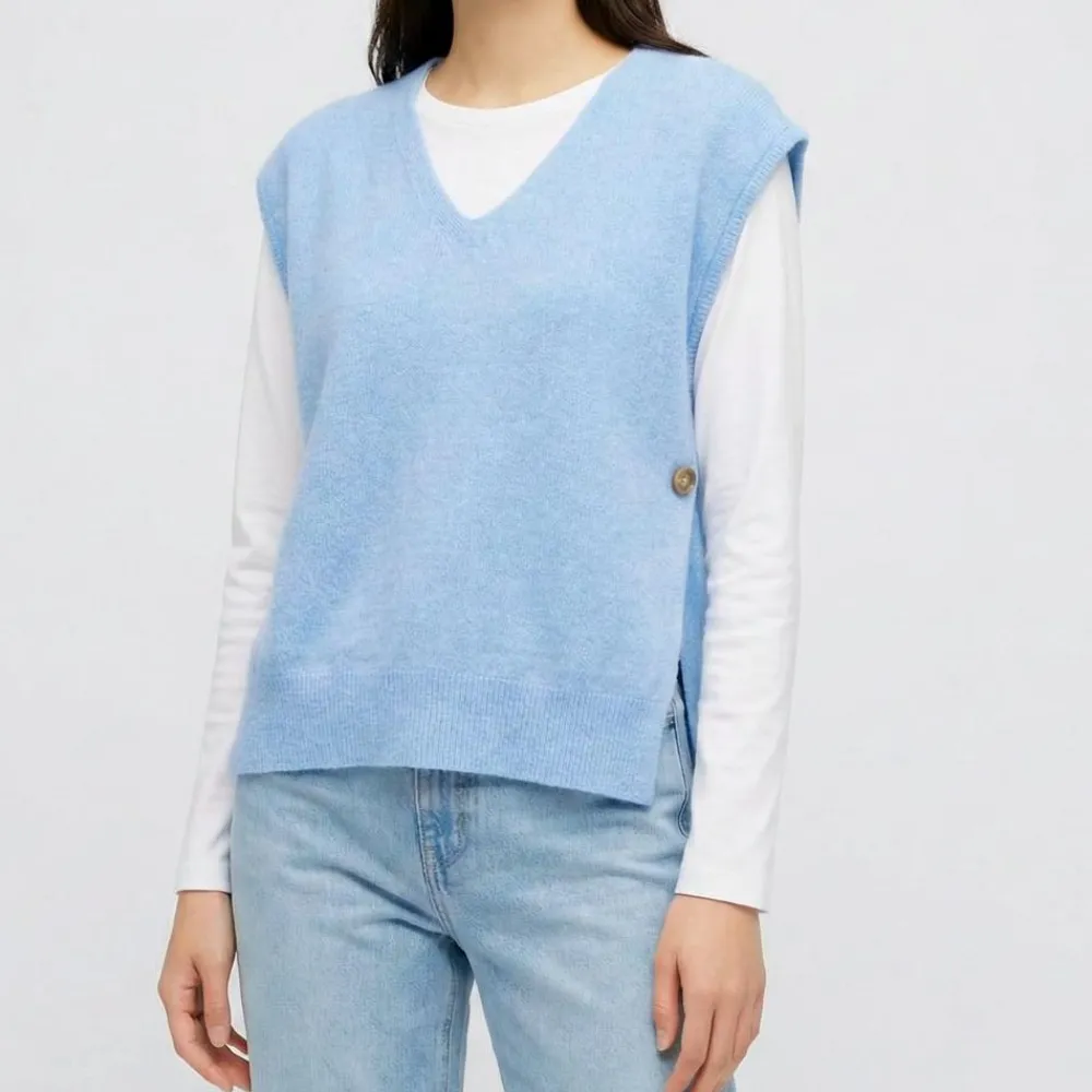 En ærmeløs strik i celeste blå giver et roligt udtryk og et let lag, der varmer uden at fylde. Den v-formede udskæring og den rene silhuet gør det nemt at style over en skjorte eller trøje, mens ribkanten samler formen. De diskrete sideknapper i trælook sætter et fint punktum og giver ekstra karakter. Se flere veste til lag-på-lag i garderoben.