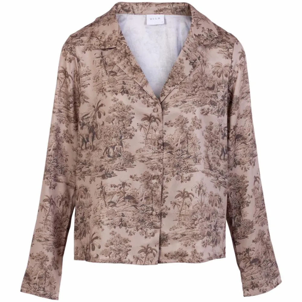 Vila dame skjorte. Smart skjortebluse med “jungle” print. Skjorten har en nedringet V-udskæring og er lavet i et silke-look.