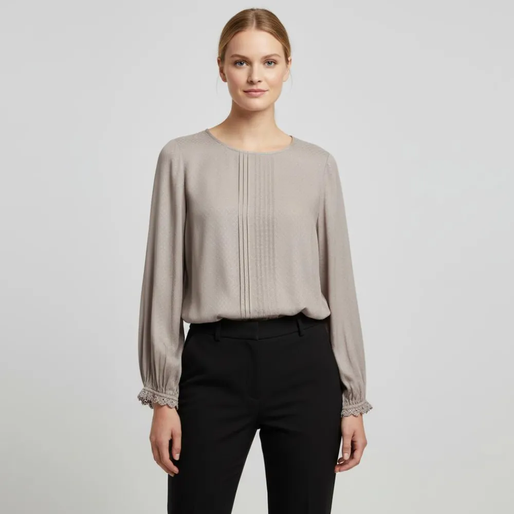 ZbyZ plus-size bluse med fine detaljer. Blusen har en rund halsudskæring, fine drapereringer langs midten på fronten og et flot struktur i materialet. Den er lavet i en let og luftig kvalitet og de lange ærmer har elastik ved håndledet med en broderet flæsekant.