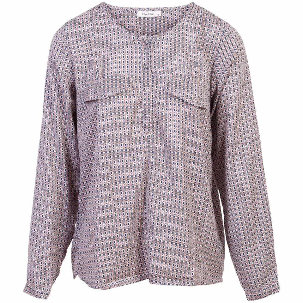 ZbyZ dame plus size bluse m. print. Bluse i et flot all-over print med fire knapper foroven, to brystlommer, rund halsudskæring samt knaplukning ved håndleddet.