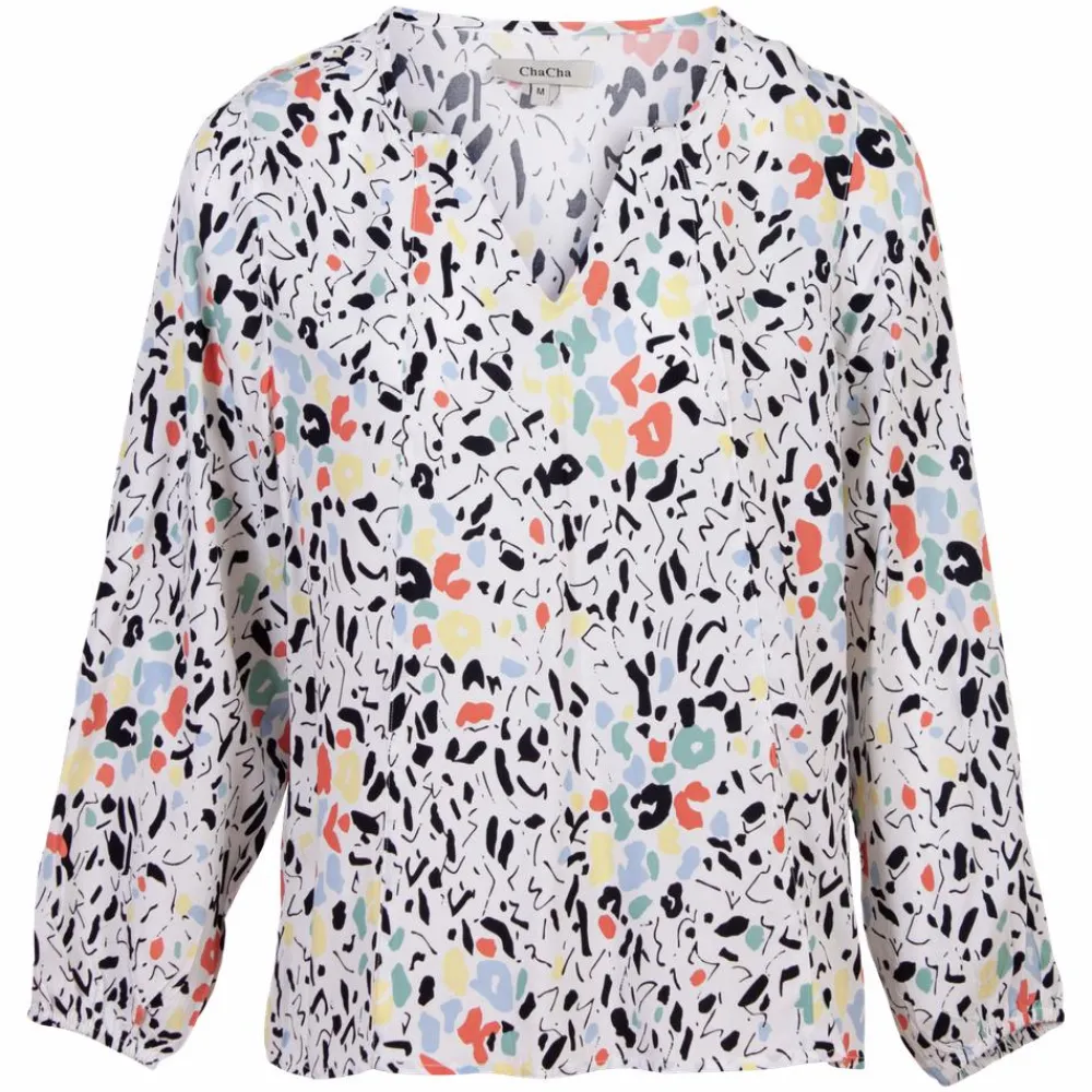 ZbyZ plus size dame skjortebluse. Skjorteblusen har all-over print, samt v-haludskæring. Skjorteblusen har elastik i ærmerne, som gør at den tilpasser sig om armene.