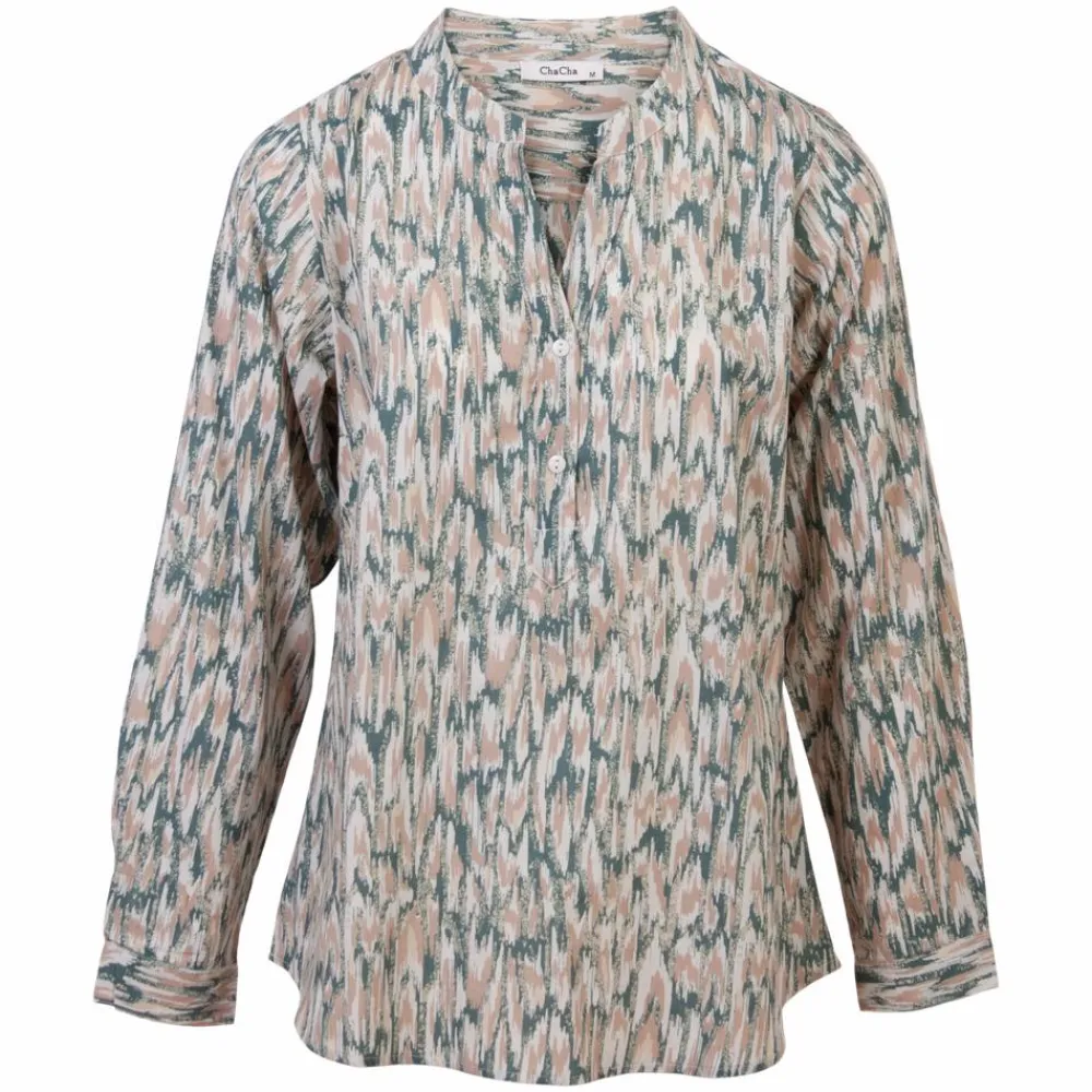 ZbyZ plus size dame bluse. Skjorteblusen har gennemgående mønster, samt 2 knapper ved brystet og knapper ved ærmerne.