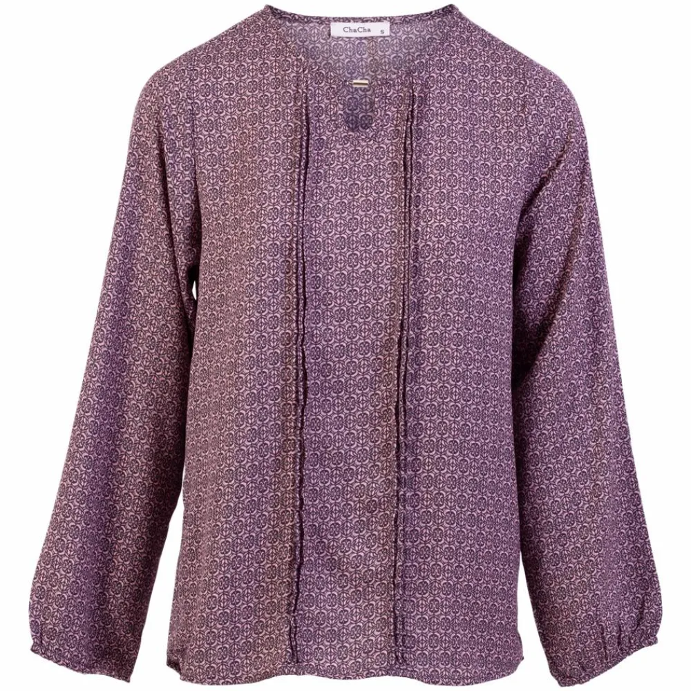 ZbyZ plus size langærmet bluse. Flot langærmet bluse i smukt all-over print. Blusen har flæse detaljer på fronten, rund halsudskæring med hul detalje samt elastik ved ærmegabet.