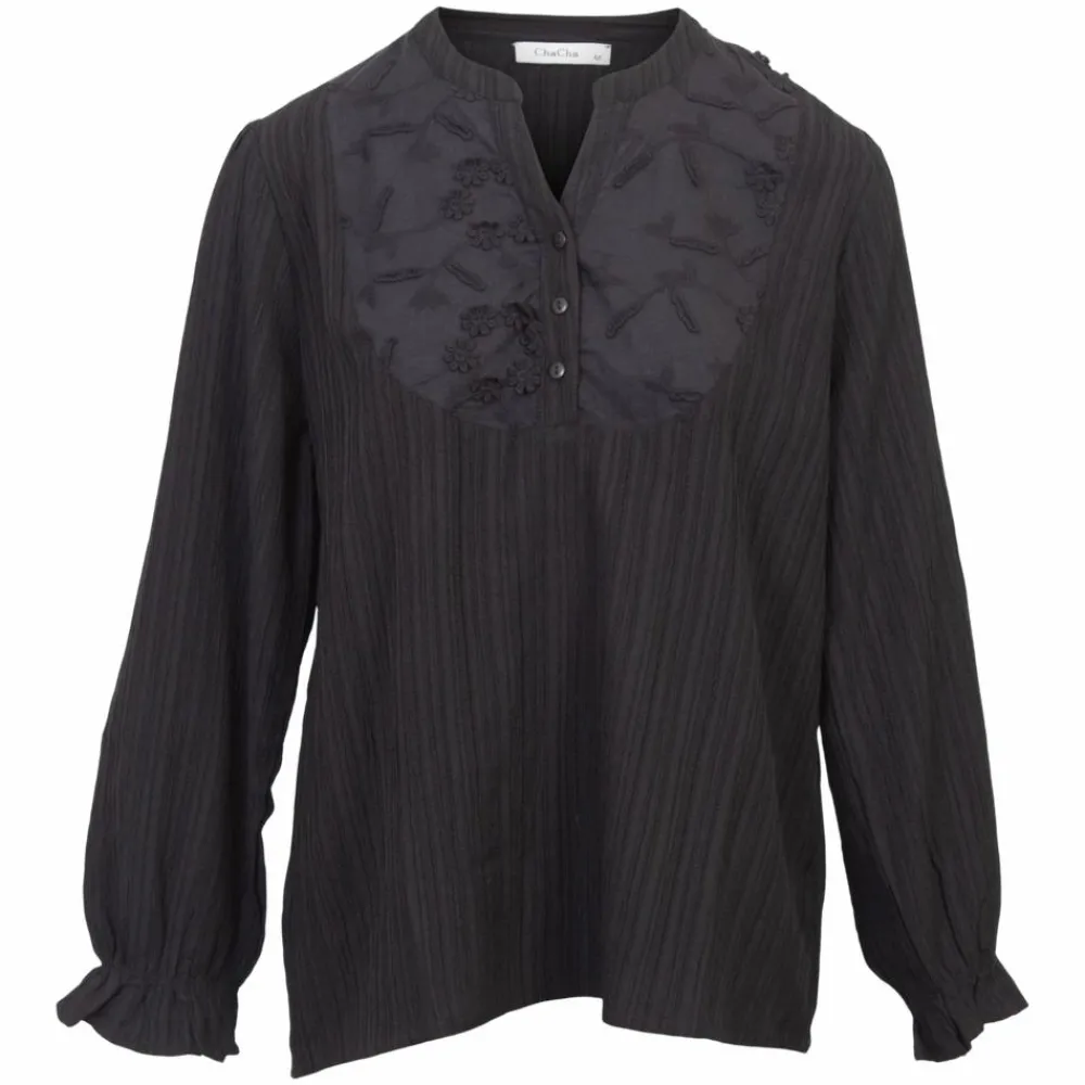 ZbyZ dame +size langærmet bluse med flotte broderede detaljer og en smal elastik i ærmet, som gør blusen ekstra fin. Blusen er designet med rund hals og stolpelukning med 3 knapper.