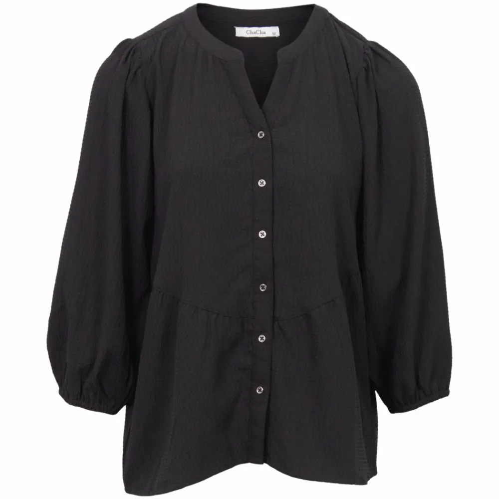 ZbyZ dame bluse med struktur i stoffet, gennemgående knaplukning, rund halsudskæring samt trekvartærmer med elastik. Blusen har skæringer, som giver en flot pasform.