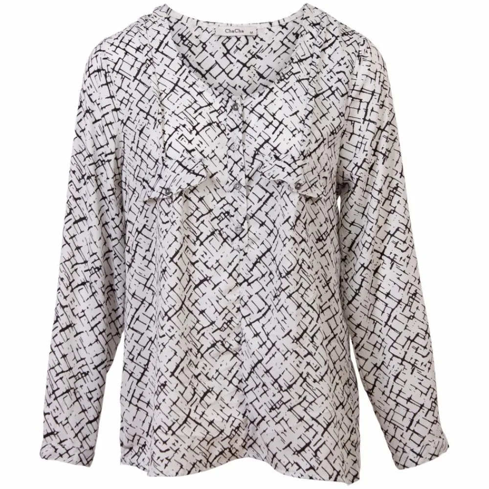 ChaCha dame bluse. Blusen har gennemgående mønster, samt 4 knapper på brystet og 2 pynte brystlommer. Blusen har en knappe i ærmet.
