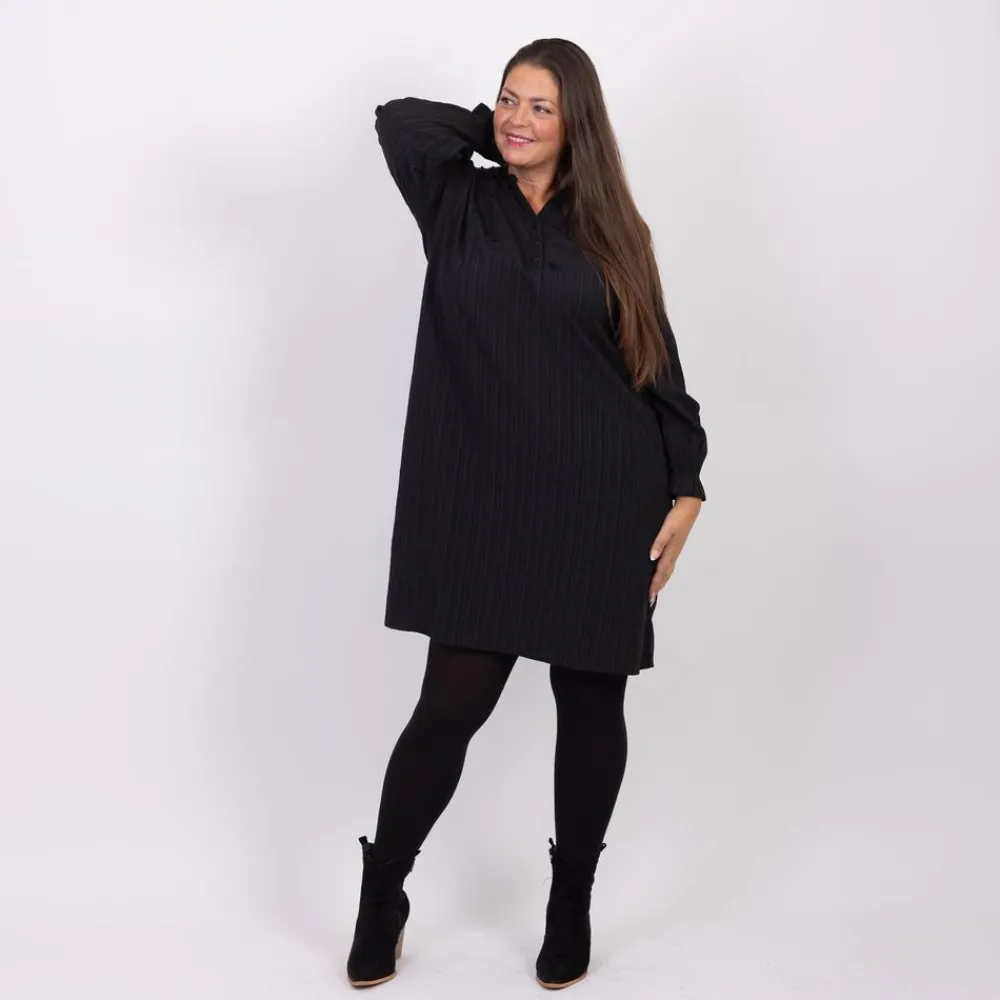 ZbyZ plus size dame kjole med fin struktur i stoffet. Den flotte kjole har fine detaljer med broderi ved brystet. Kjolen har ærmer med en smal elastik ved håndleddet.