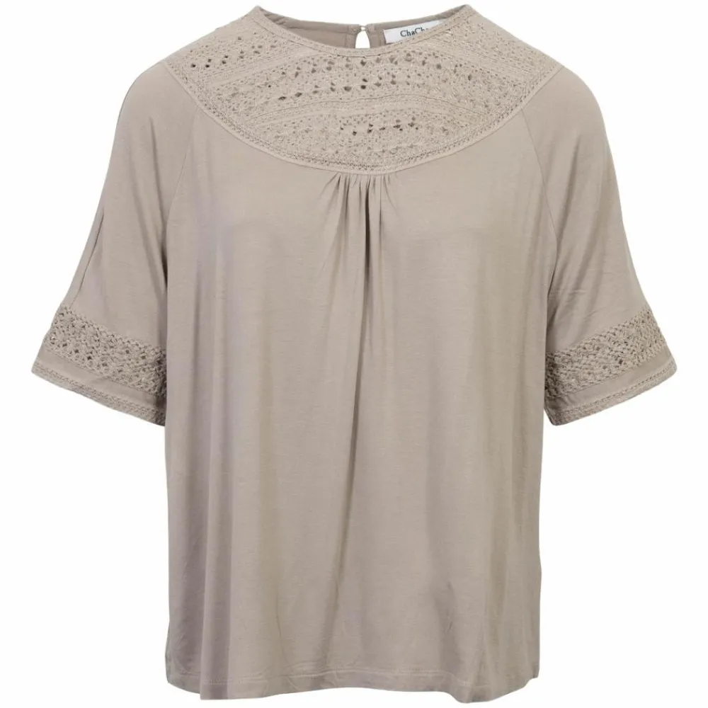 Flot dame plus size t-shirt fra ZbyZ med fine detaljer på fronten og ved ærmegab. Blusen får et ekstra strejf af elegance med læg foran, som får blusen til at falde flot på kroppen. Den kortærmede bluse har rund hals og lukkes med en enkelt knappe i nakken.
