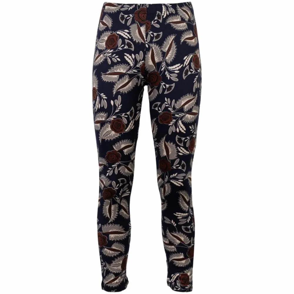 En tætsiddende model med levende blomsterprint på dyb marineblå bund. De fleksible paneler følger kroppen og giver fri bevægelse fra talje til ankel. Den elastiske linning gør dem lette at hoppe i og behagelige hele dagen.