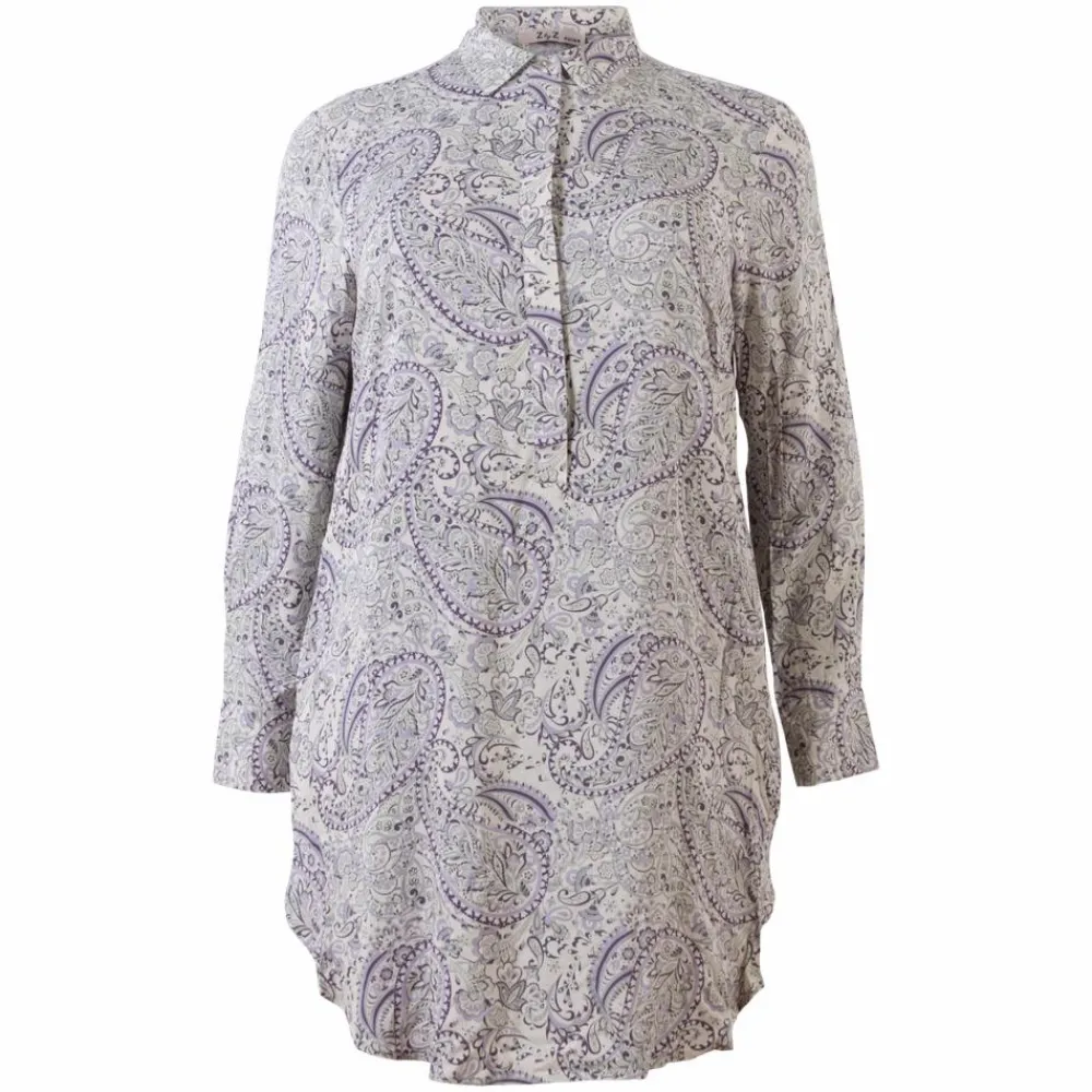 ZbyZ plus size dame langærmet tunika med all-over print. Tunikaen har krave, skjulte knapper ved brystet, lommer samt tre knapper nederst i ærmet.