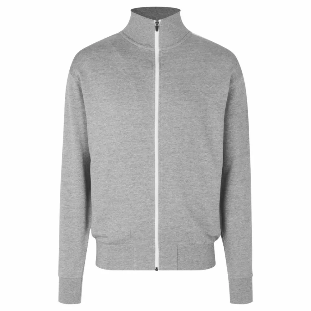 ID herre cardigan. Sporty cardigan i kraftig kvalitet. Hvid kontraststrib på ærme. Gennemgående lynlås og to sidelommer med lynlås i hvid. Nakkebånd, nakkespejl og rib ved ærme og bund. Ubørstet inderside.