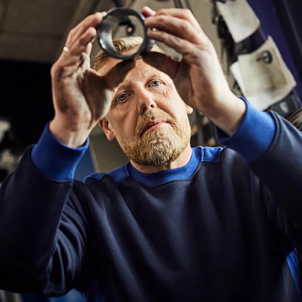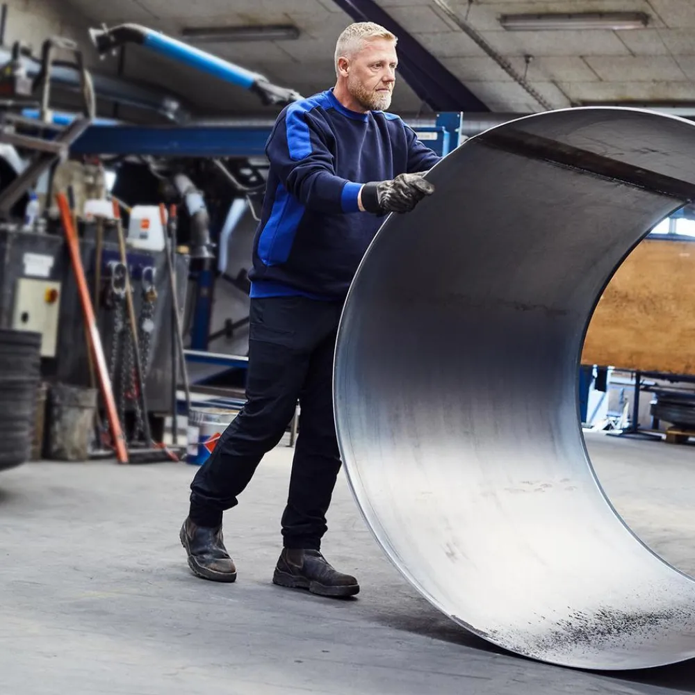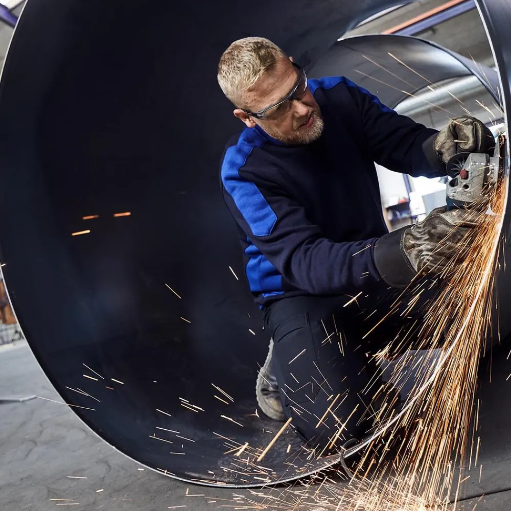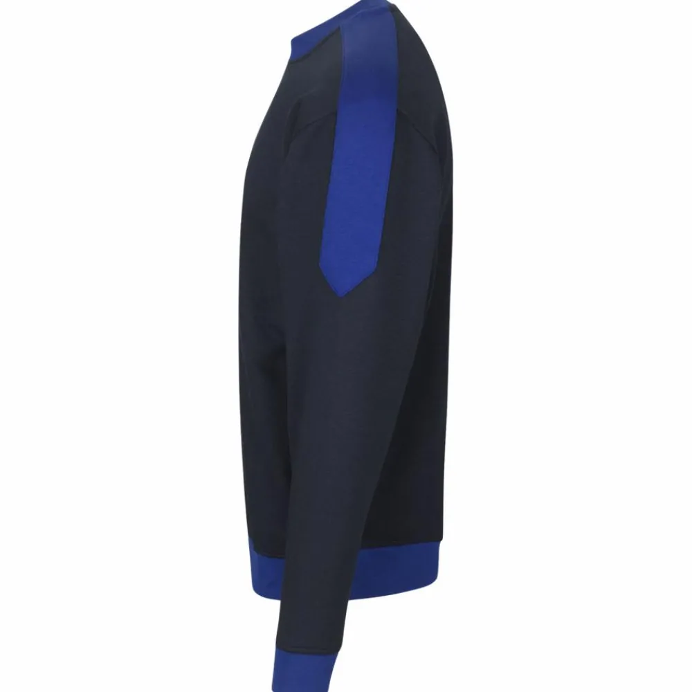 Ekstra slidstærk to-farvet sweatshirt med rund hals. Dobbeltstikninger og rib ved hals, ærme og bund. Blød børstet inderside. Sweatshirten har gennemgået en forkrympningsproces ved meget høje temperaturer, både før og efter indfarvningen for ekstra stabilitet og lang levetid.