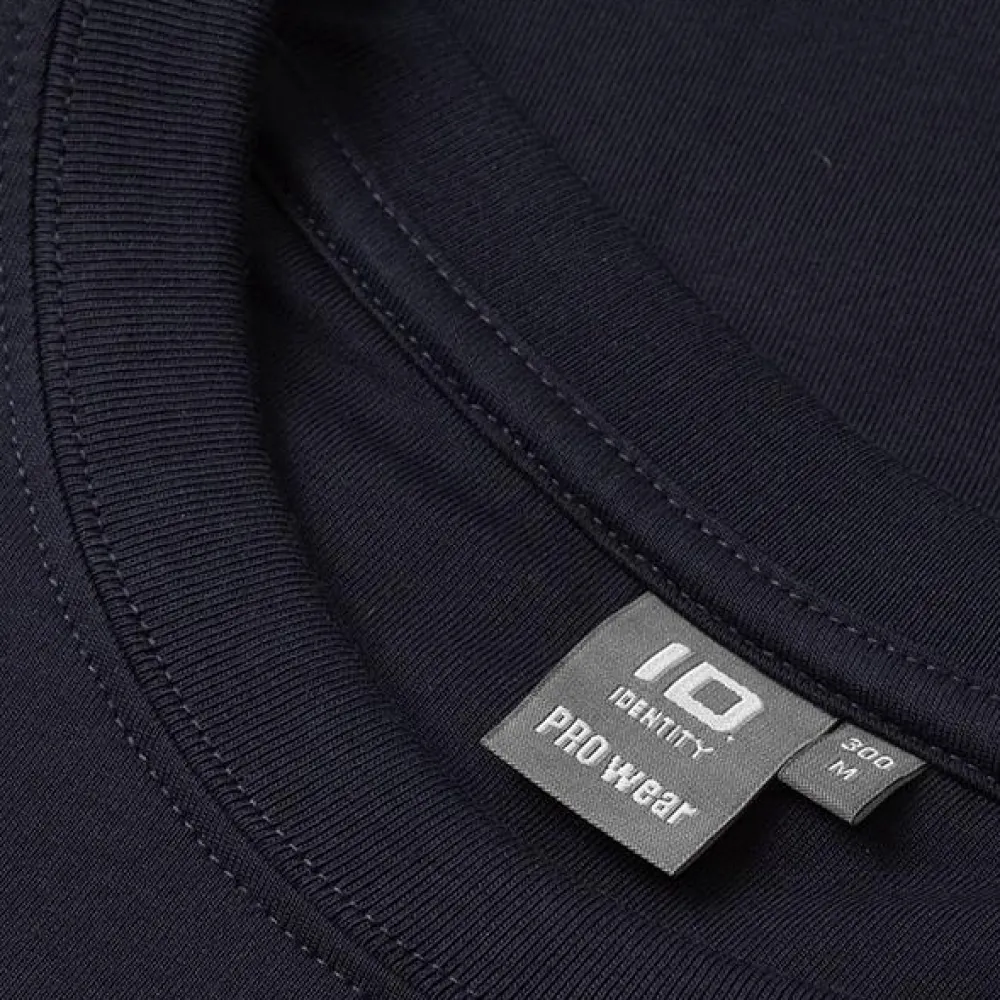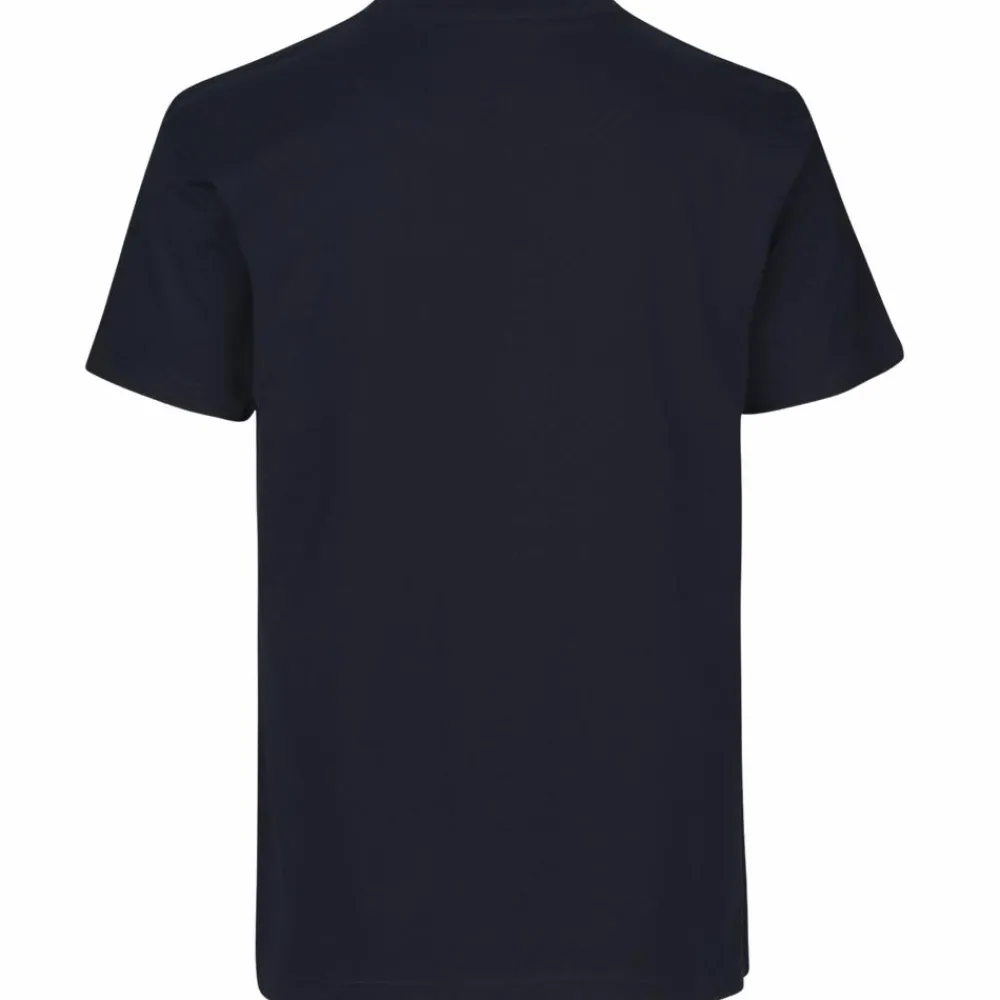 ID Pro Wear herre T-shirt. T-shirten har fire-lags halsrib, nakke- og skulderbånd og nakkespejl. Den har gennemgået en forkrympningsproces ved meget høje temperaturer, både før og efter indfarvningen, for ekstra stabilitet og lang levetid.