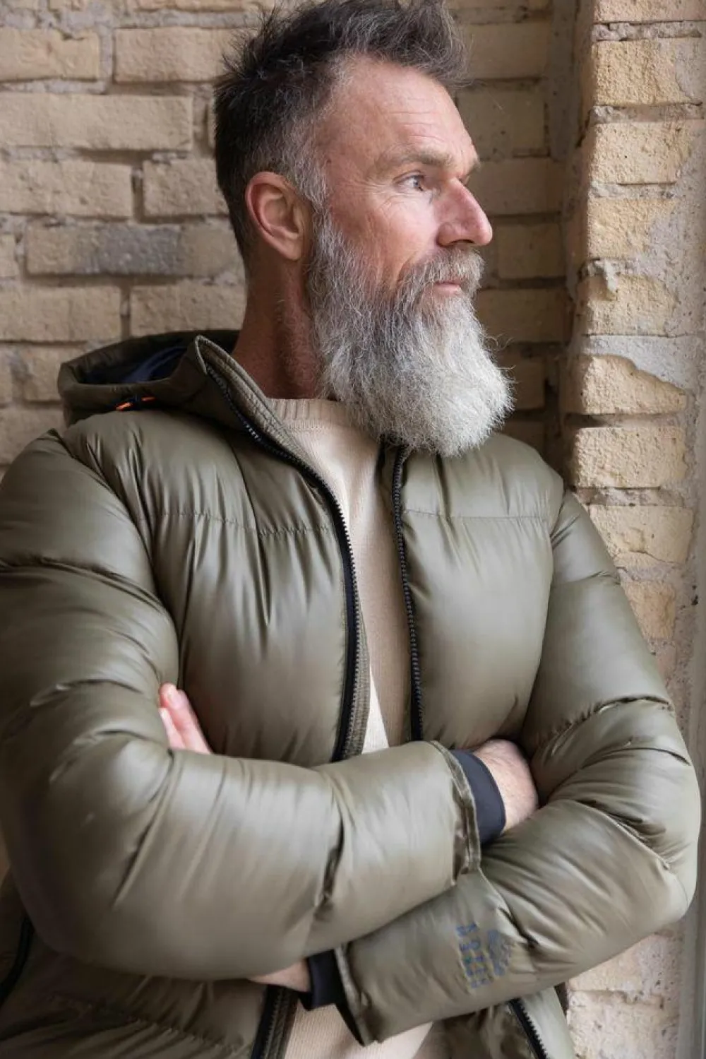 Herre vinterjakke med gennemgående lynlåslukning, to lommer med lynlås, hætte med snøre, indvendig lomme med lynlås samt vindfang ved ærmet. Det er muligt at snøre jakken ind forneden med en elastik samt spænde.