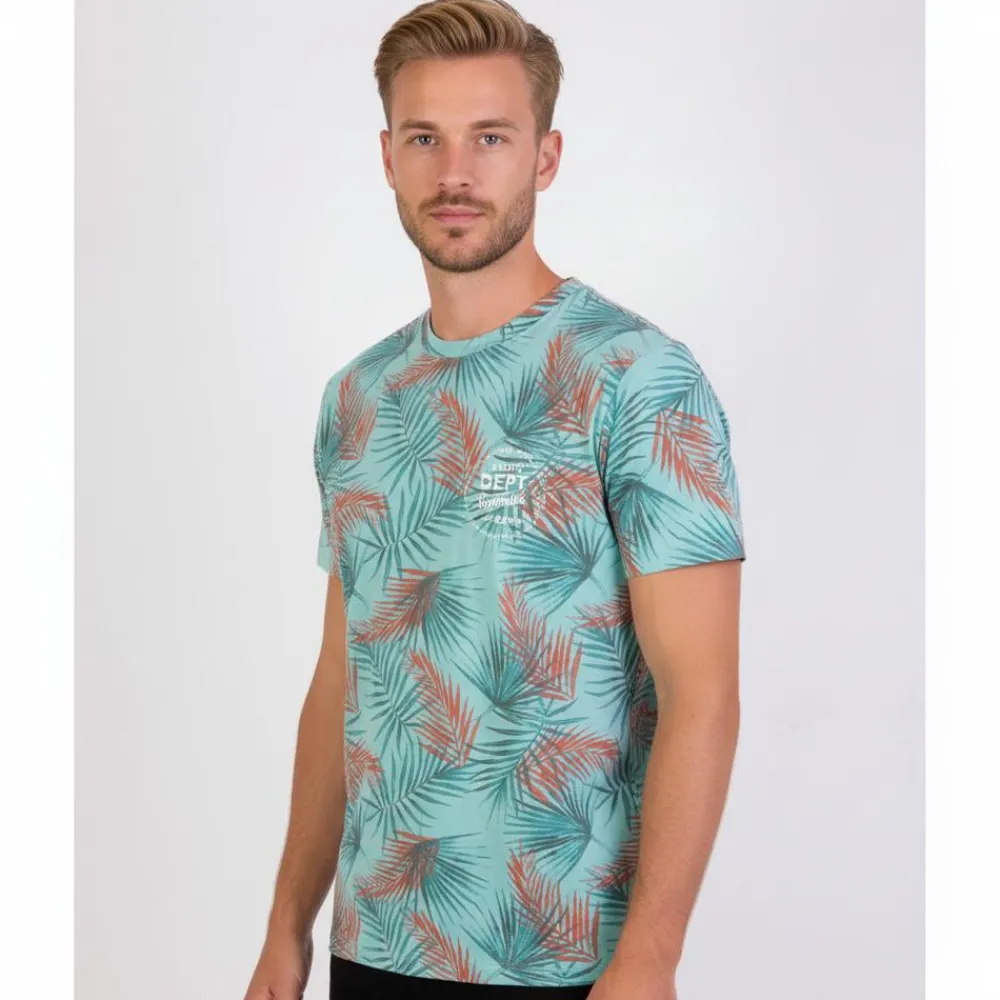 Her får du en t-shirt i klar aqua med palmeprint over hele fladen, hvor dyb blågrøn møder koralorange for et roligt, men livligt udtryk. En diskret brystdetalje med retropræg giver ekstra karakter uden at stjæle fokus. Brug den til afslappede dage, på ferien eller når hverdagen skal have et pift. Se hele udvalget af t-shirts og tanktops, og kombinér med lette shorts og knickers for et komplet sæt.