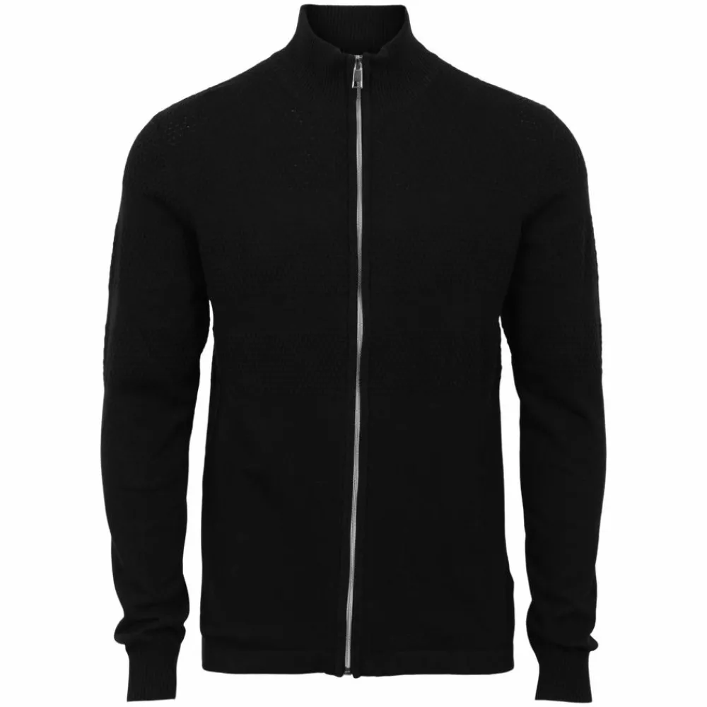 Marcus herre langærmet strik cardigan med struktur og høj hals. Striktrøjen har gennemgående lynlåslukning.