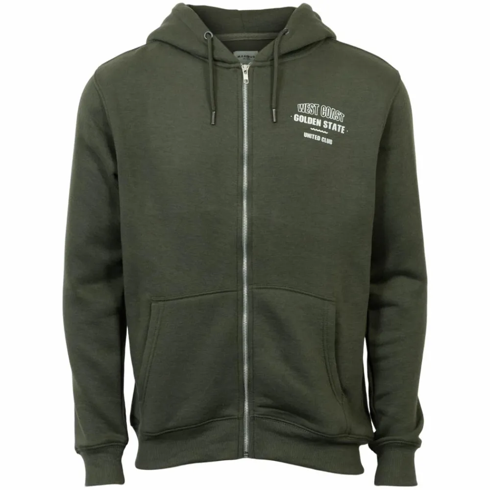 Marcus herre sweatcardigan med hætte og gennemgående lynlås. Cardiganen har broderet mærke på den ene side af fronten, en kængurulomme og snøre i hætten.