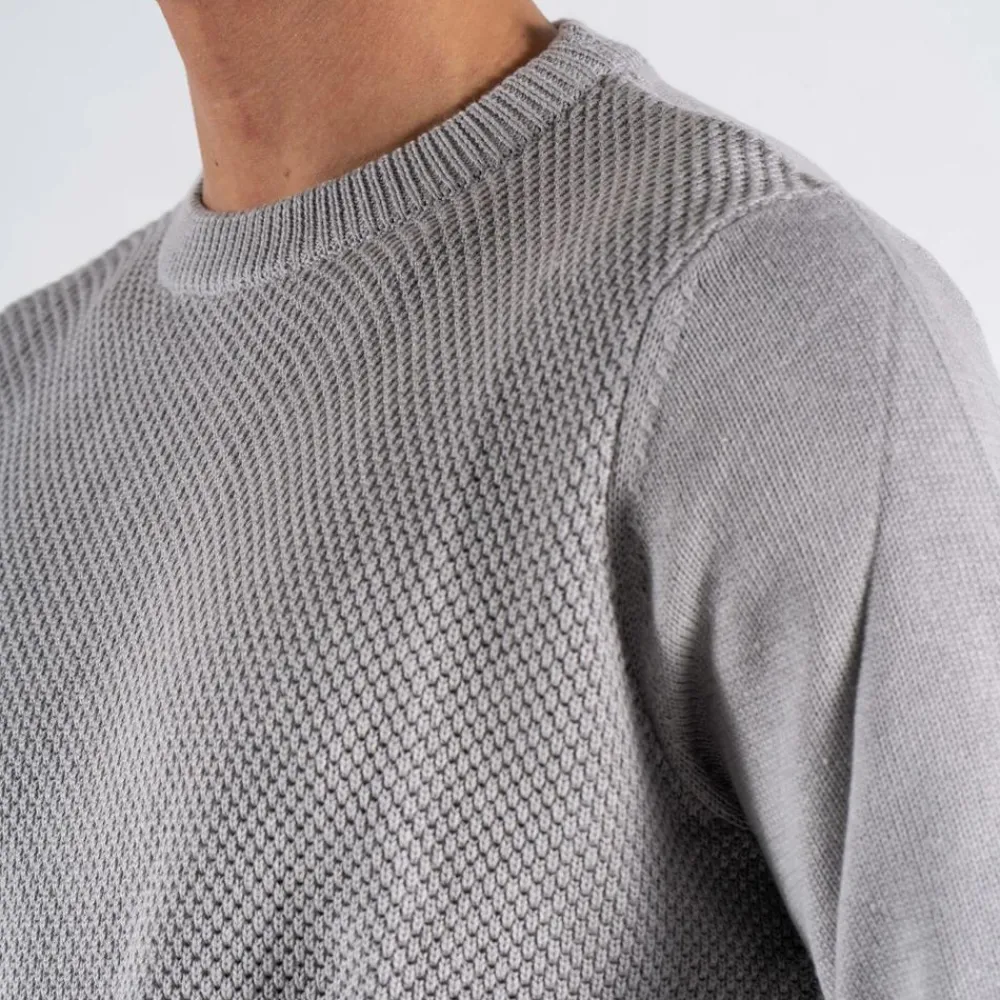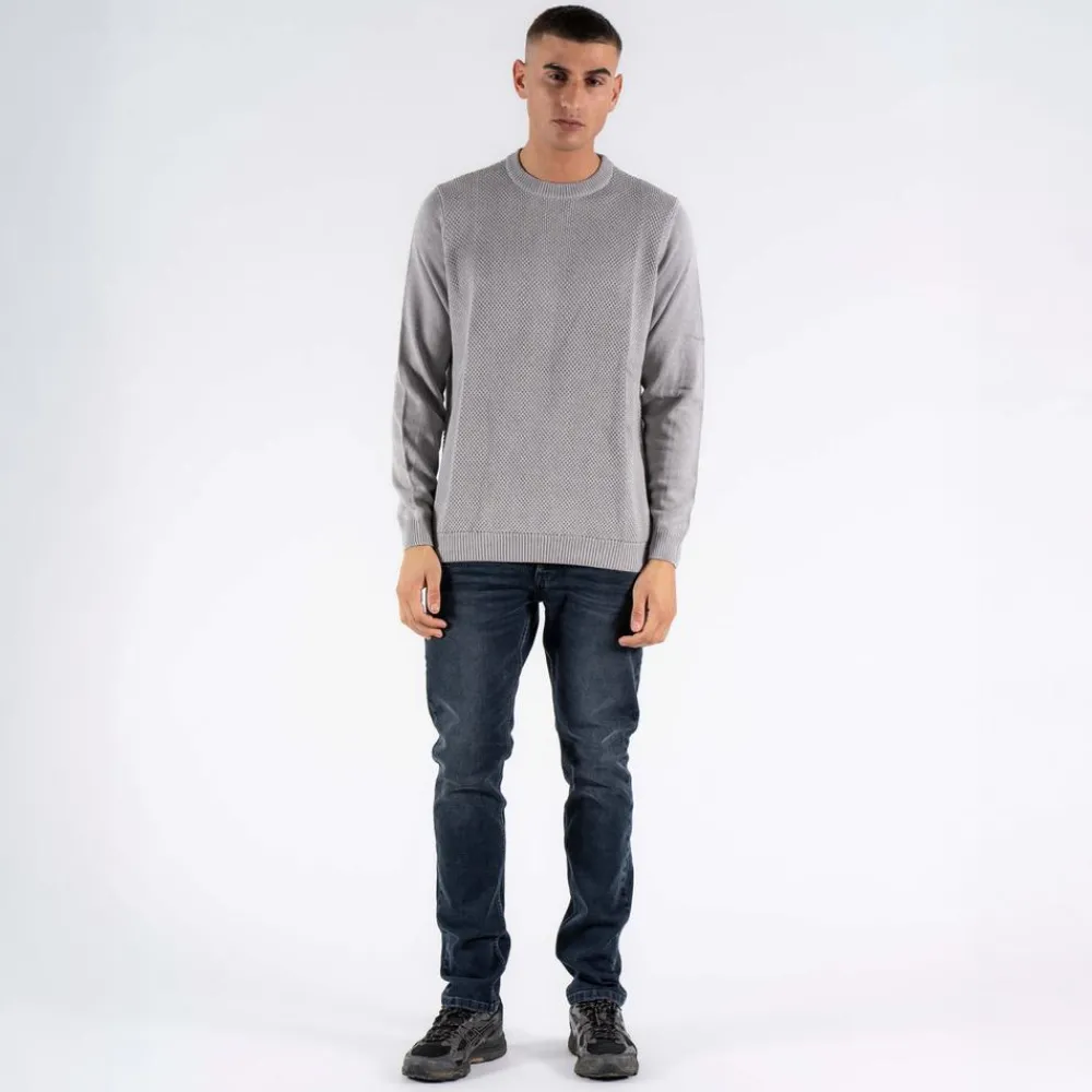 Denne striktrøje i lys grå melange giver et roligt udtryk, der passer til alt fra jeans til pæne bukser. Den bløde vaffelstruktur og den runde hals skaber et tidløst look med rib ved hals, manchetter og kant, så formen holder. Den almindelige pasform gør den nem at bruge alene eller som lag over en skjorte eller en let top, uanset om dagen byder på arbejde, weekend eller familiebesøg. Sæt den sammen med skjorter for et pænt udtryk, eller brug den over basis fra t-shirts og tanktops for en afslappet stil.