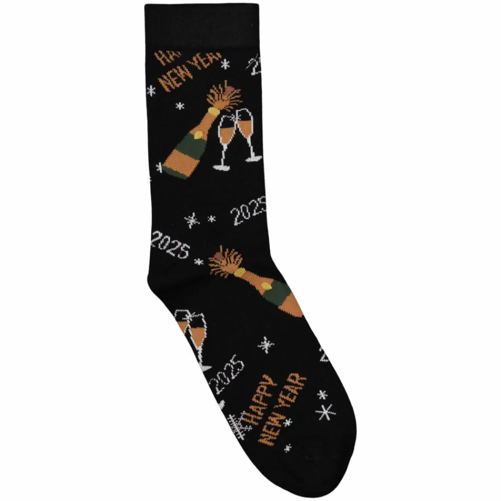Sæt et smil på garderoben med sorte/grønne strømper til herre, pyntet med champagneflasker, glas, stjerner og 2025-detaljer. Designet giver et let festligt præg, der fungerer til både kontoret og nytårsaften – fra kondisko til støvler. Behagelig pasform og elastisk kant holder dem på plads, så du kan fokusere på det vigtige med familie og venner. Se flere strømper.