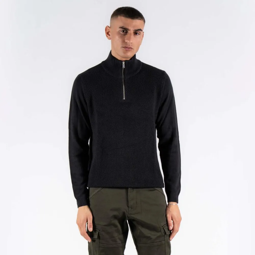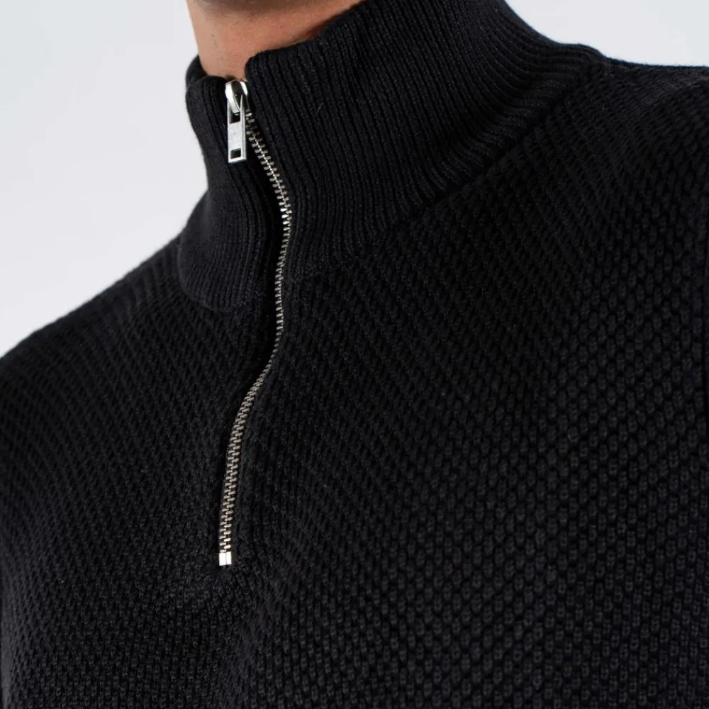 Den bløde blanding af 50% bomuld og 50% akryl giver en god balance mellem åndbarhed og varme, så den fungerer fra kontor til weekend. Den diskrete struktur i strikken og den enkle lynlås skaber et moderne udtryk, der spiller godt sammen med både hverdagsbukser og pæne bukser, eller brug den over skjorter for et mere klædt udtryk.