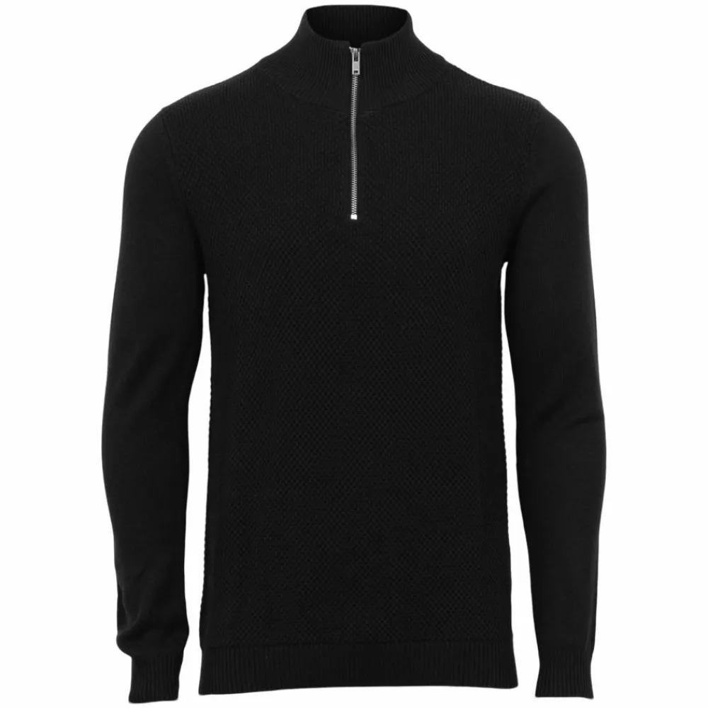 En tidløs striktrøje med halv lynlåsåbning og høj krave, der giver fleksibel varme og et rent udtryk. Den almindelige pasform og de ribbede afslutninger ved ærmer og kant sikrer en behagelig fornemmelse, uanset om den bæres alene eller over en skjorte. Se flere strik og cardigans til garderoben.