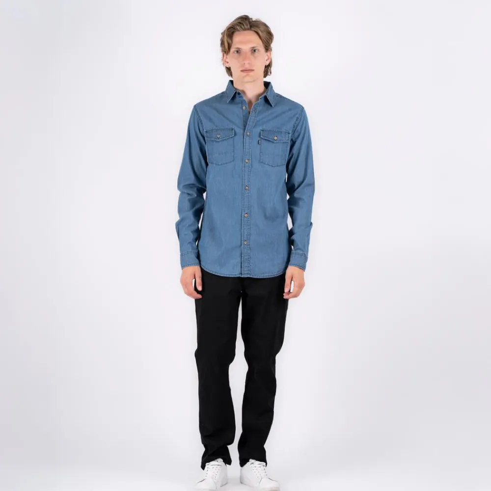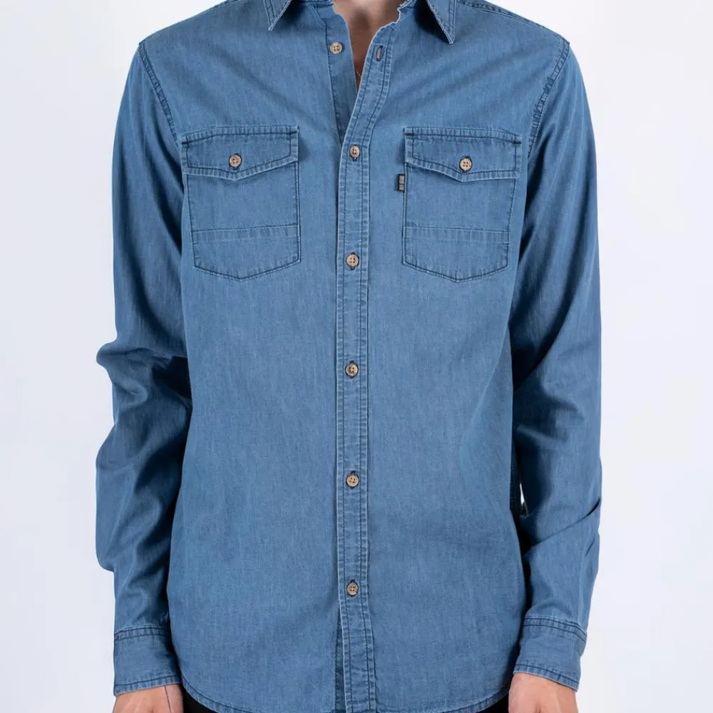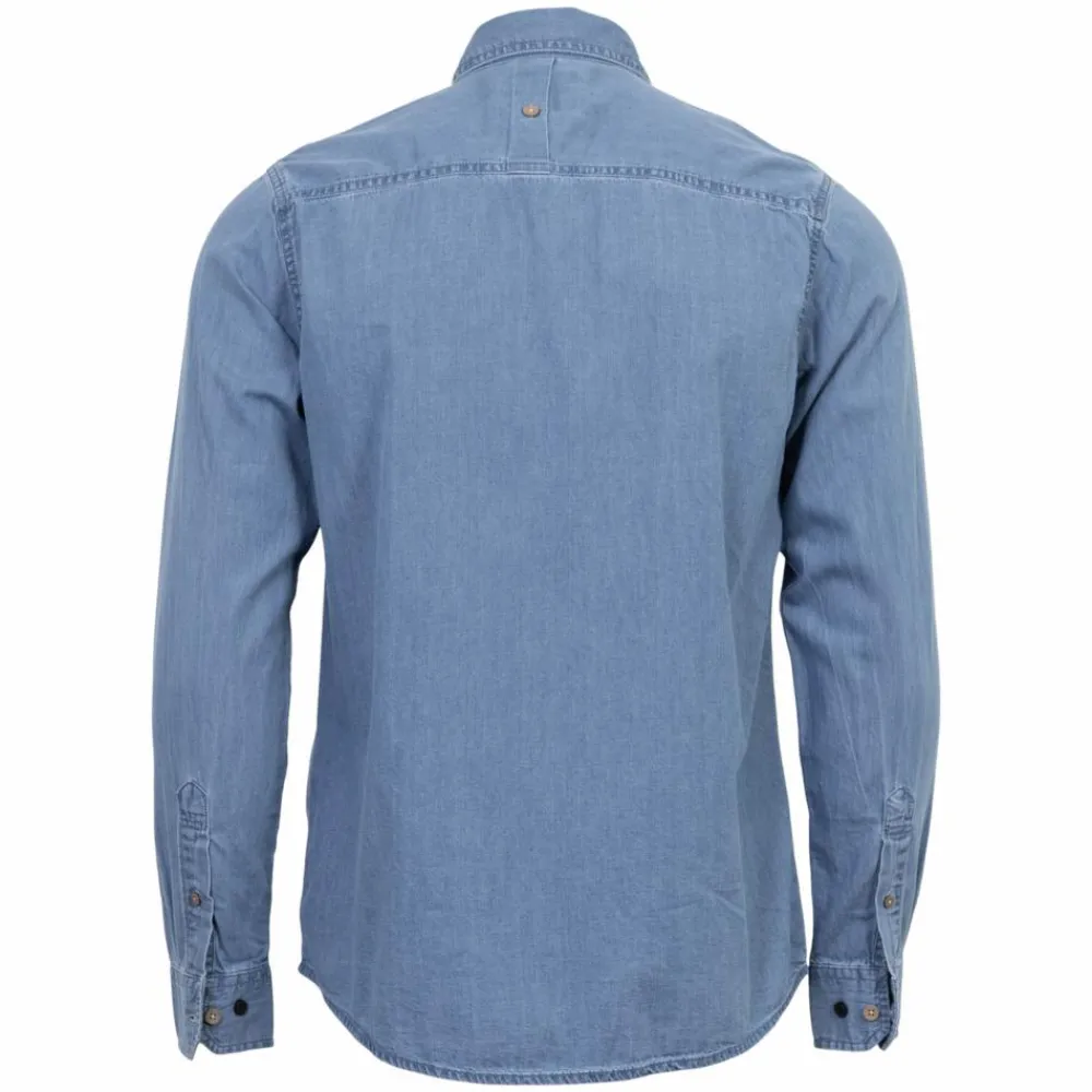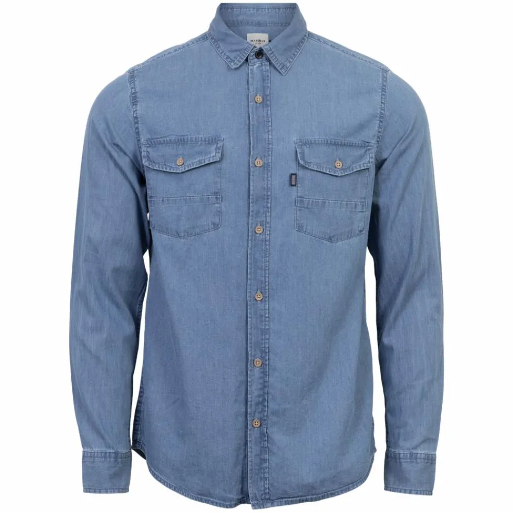 Marcus denim skjorte i mørkeblå denim. Skjorten har to brystlommer med knapper, og en gennemgående knappelukning.