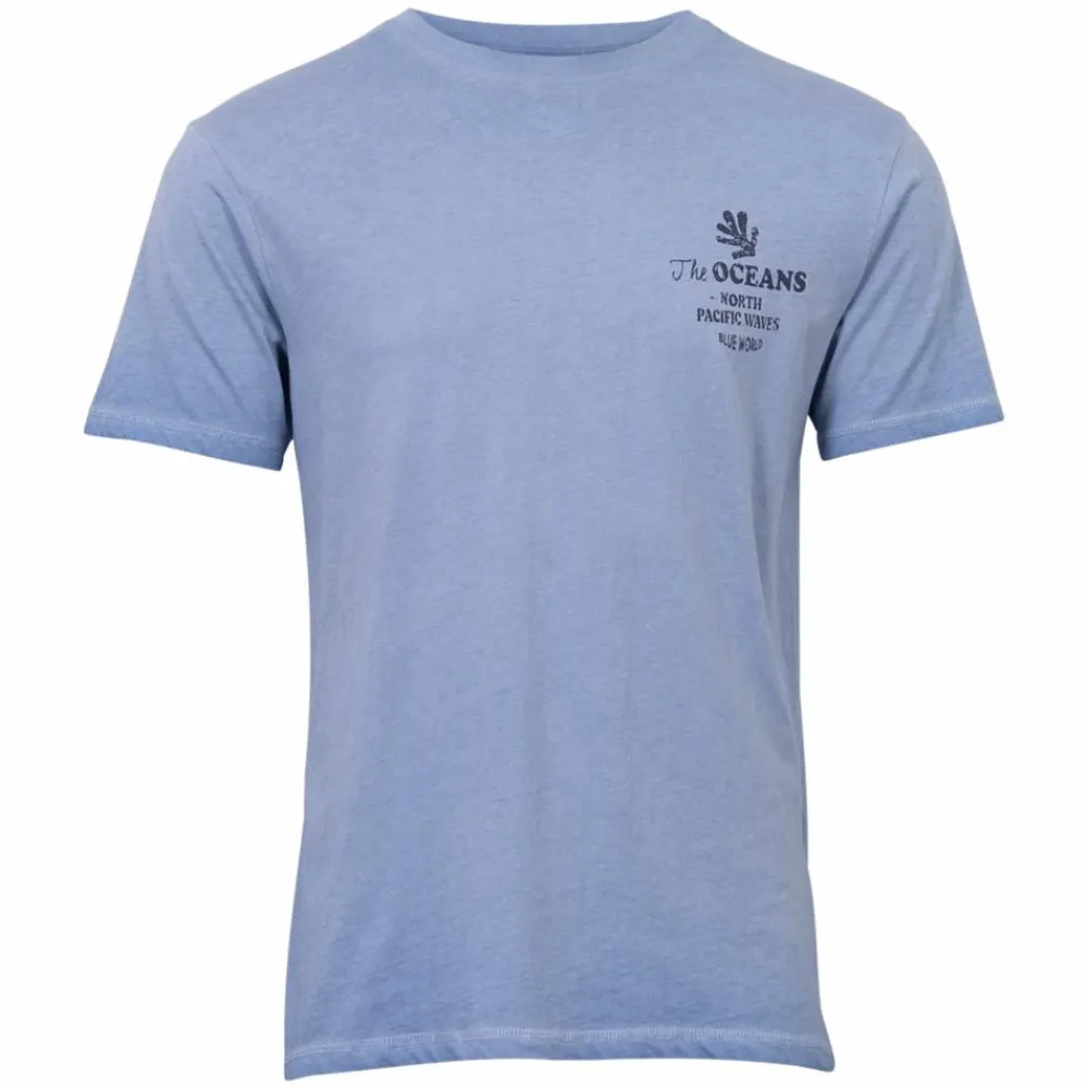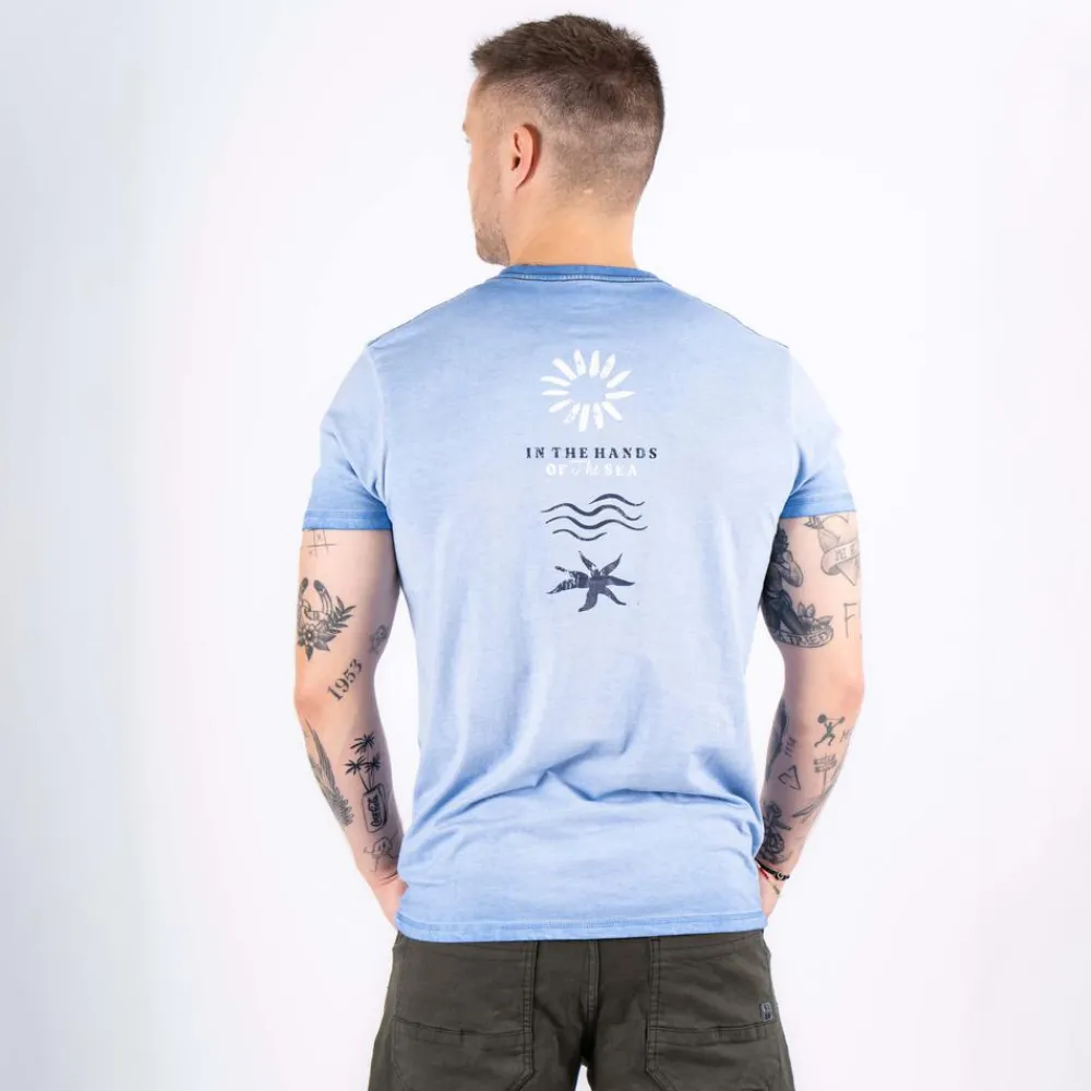 En blød Summer Blue giver et roligt udtryk, der klæder alt fra lyse jeans til mørke chinos. Den klassiske rund hals og korte ærmer holder stilen enkel, mens et diskret brysttryk med havtema giver karakter uden at larme.