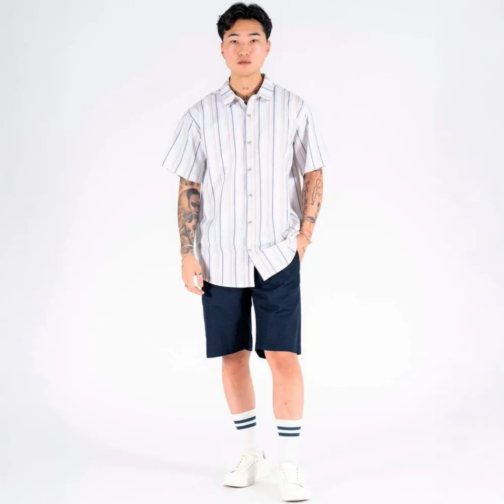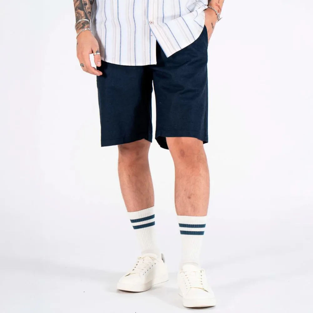 Marcus shorts i ensfarvet mørkeblå. Shortsene har snøre i taljen, som gør det muligt at justere shortsene. Shortsene har to sidelommer og to baglommer. Shortsene er fremstillet i en blanding af hør og bomuld, som gør dem behagelige at have på.