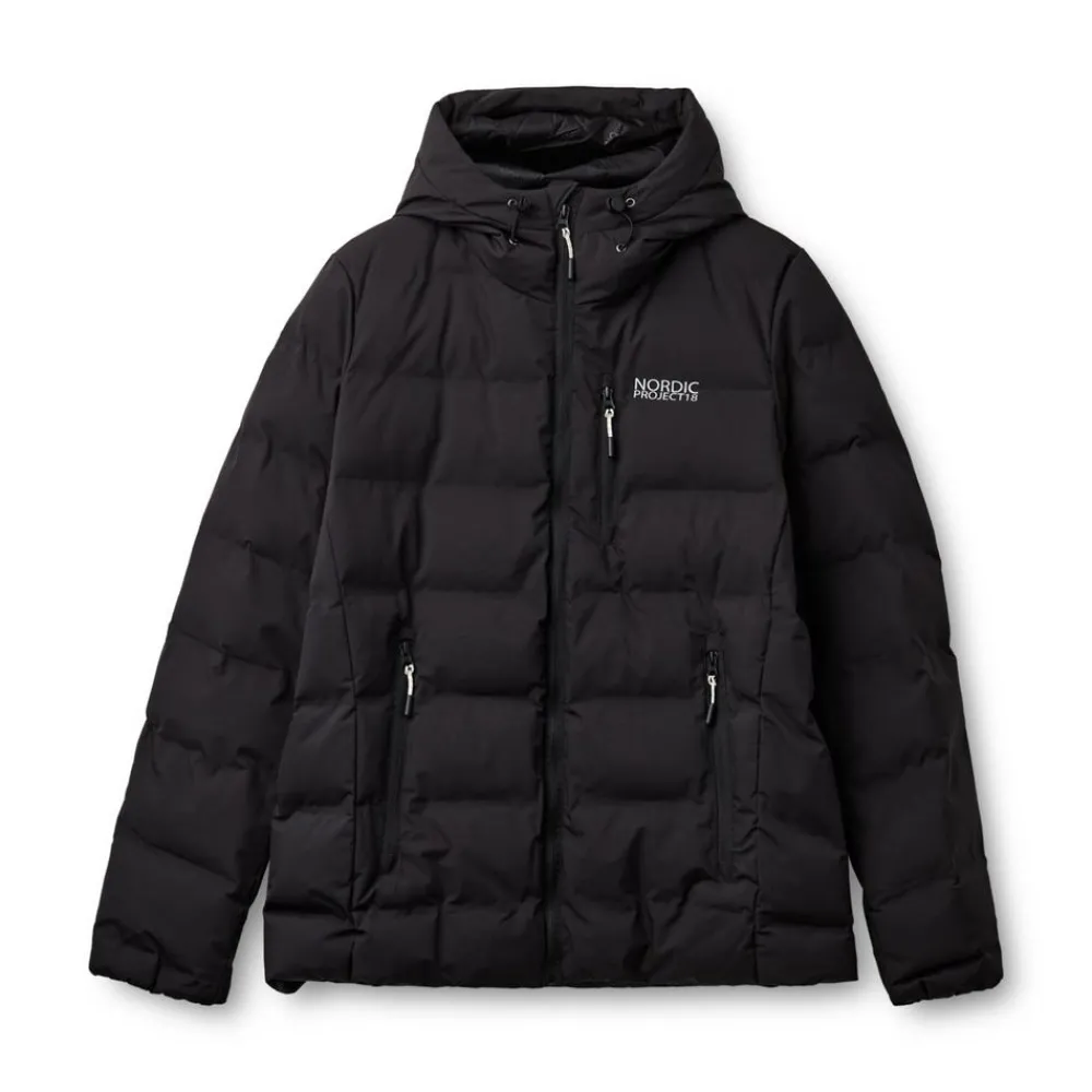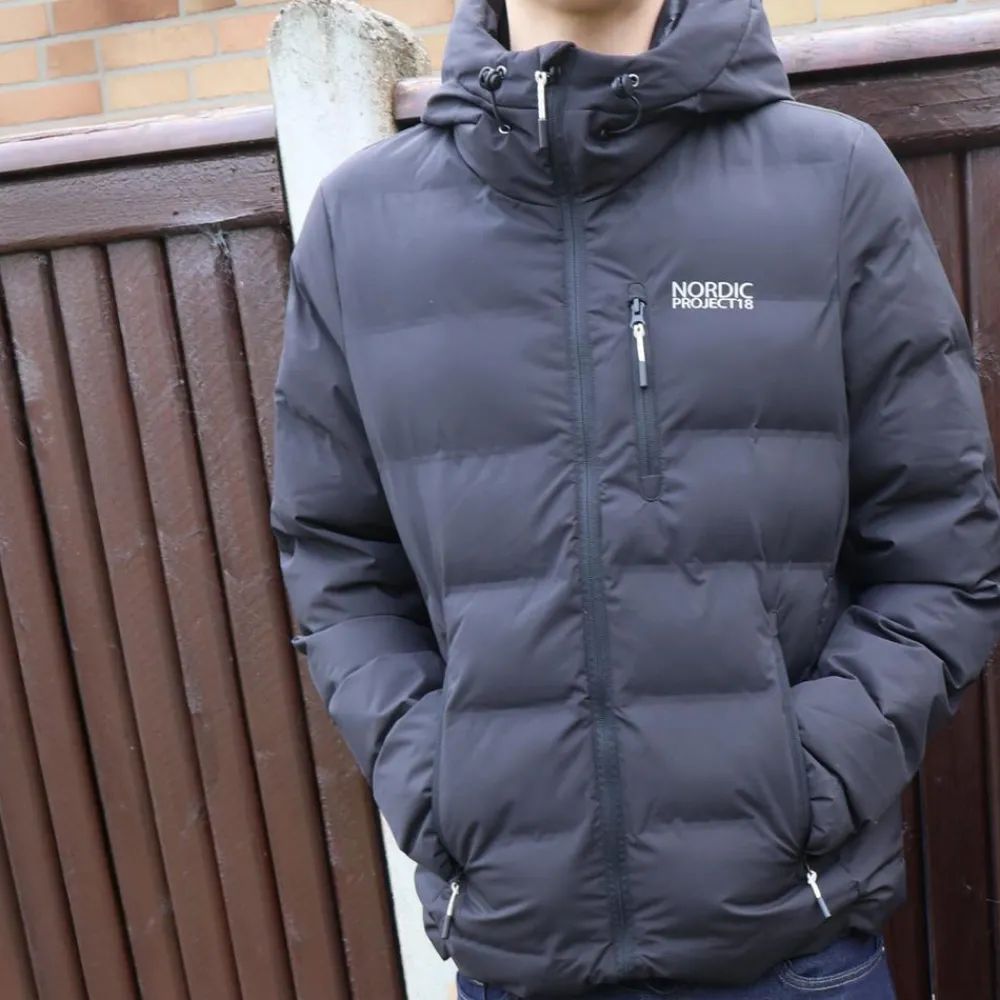 Varm og isolerende puffer vinterjakke fra Nordic Project18. Dynejakken har ekstra varme-effekt og er perfekt til de kolde vintermåneder. Jakken har en høj hals, gennemgående lynlåslukning og hætte med justerbar elastiksnøre. Den har tre praktiske lynlåslommer og kan snøres ind i bunden ved hjælp af den indvendige elastiksnøre med lås.