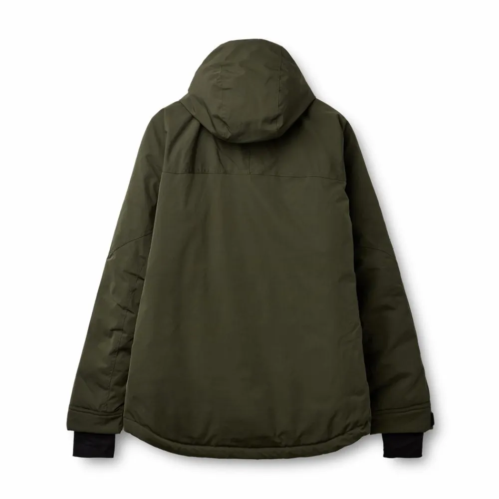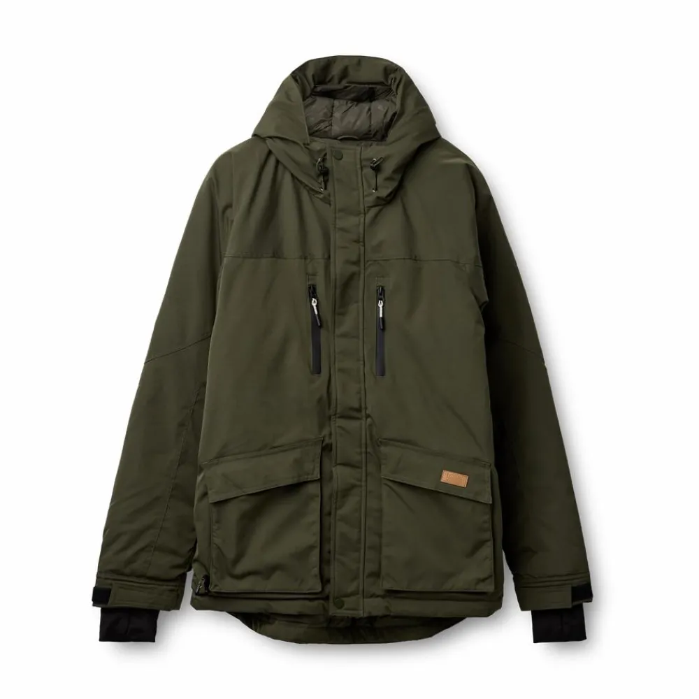 Stilren og varm herre vinterjakke fra Nordic Project 18. Jakken har en gennemgående knap – og lynlåslukning, hætten og bunden af jakken kan snøres ind ved hjælp af elastiksnøre med lås. Den har to praktiske lommer med med klap og knaplukning med adgang til hænderne i siden af lommerne. Der findes ligeledes to lodrette brystlommer med lynlås, samt en indvendig lynlås lomme. Ærmerne har vindfang og justerbar velcro lukning. Jakken er udstyret med en praktisk D-ring, til fastgørelse af nøgler, småting eller liftkort.