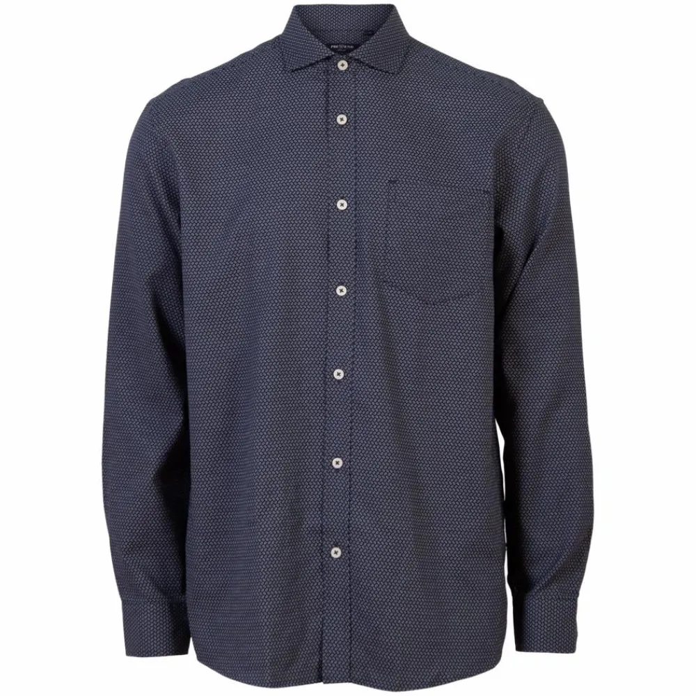Pre End herre skjorte. Skjorten er blå med små, hvide detaljer og har gennemgående knappelukning. Der er knapper i ærmerne, som gør at den kan tilpasse sig om armene. Skjorten har en brystlomme.