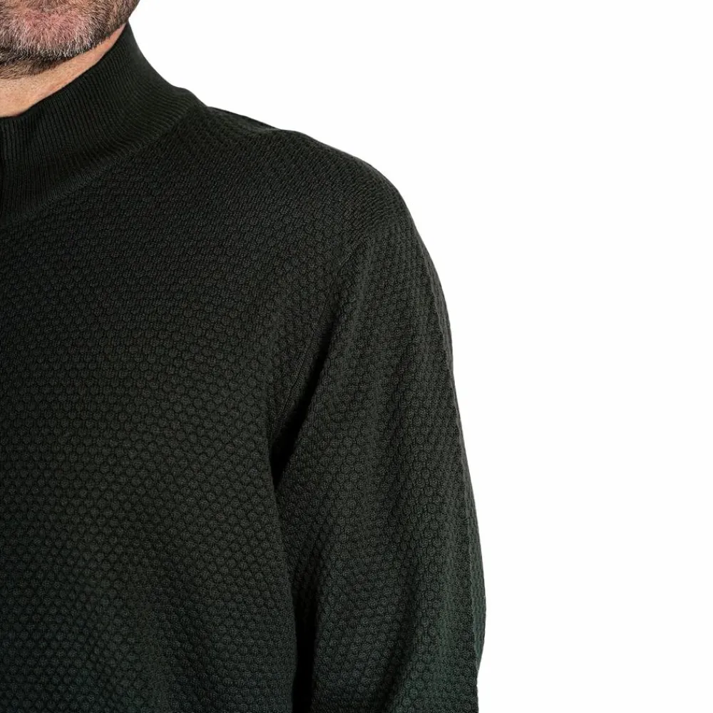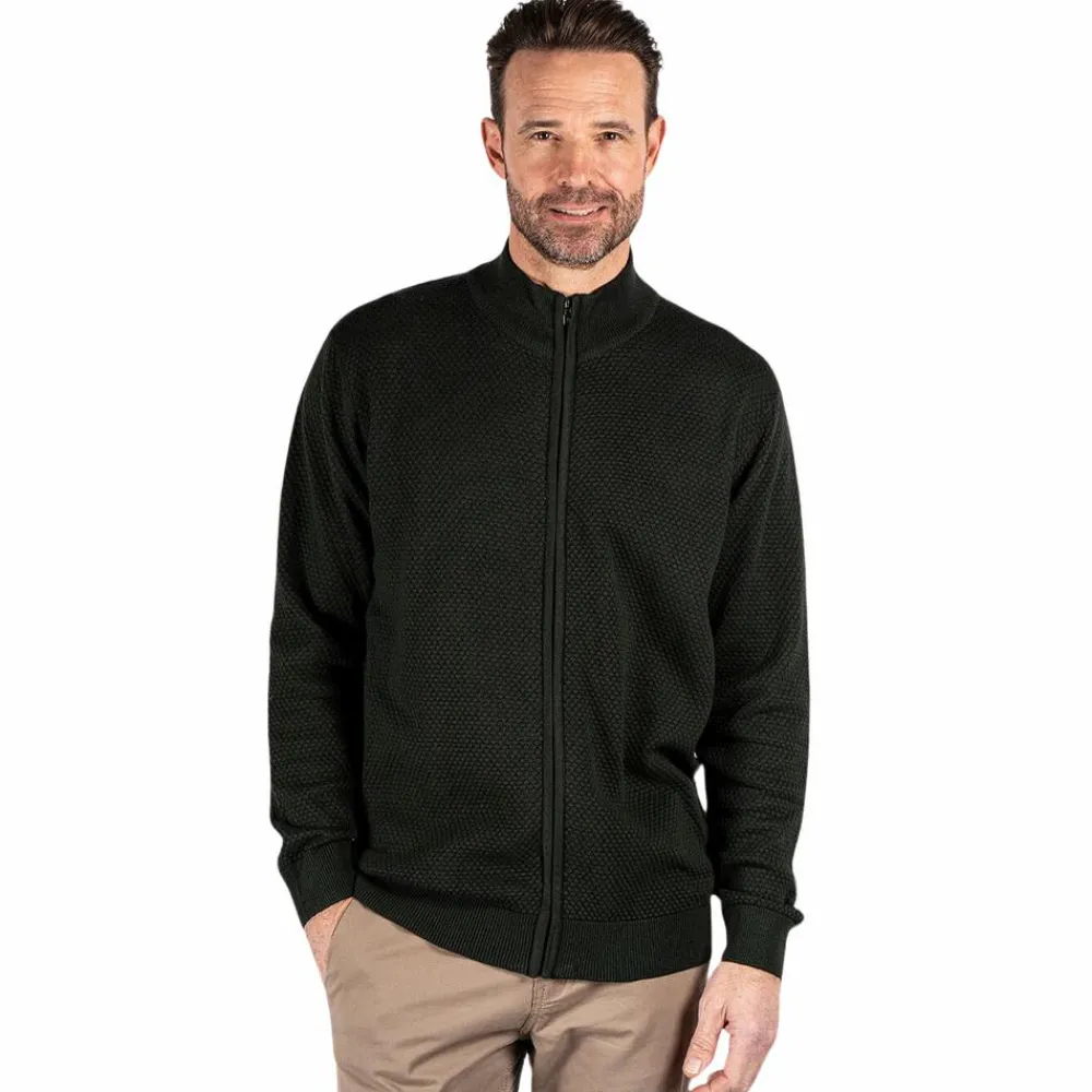 Pre End herre strik cardigan med struktur. Cardiganen har gennemgående lynlåslukning, høj hals samt ribkant ved ærmer og bund.