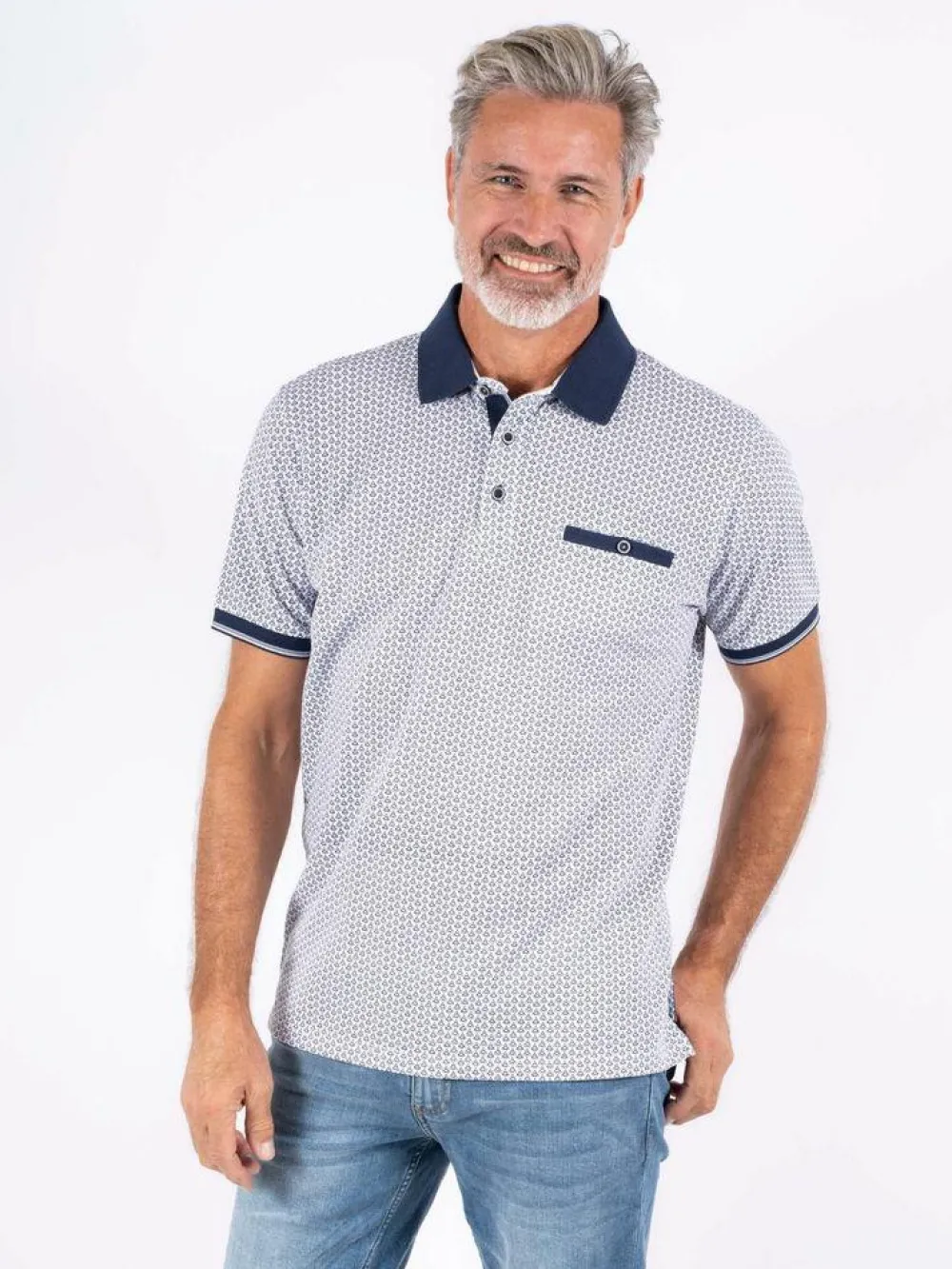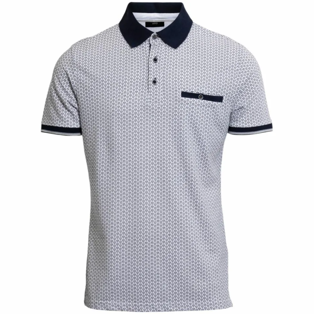 Vito herre t-shirt polo med all over print. Poloen har en klassisk sort krave og knappelukning ned langs kraven. Polo t-shirten har en lomme på venstre side og en lille slids nederst på begge sider.