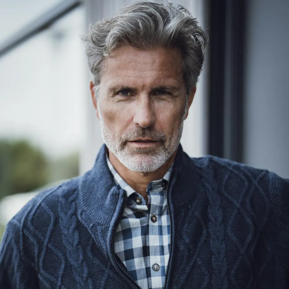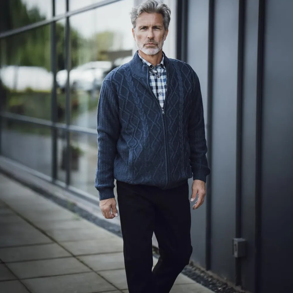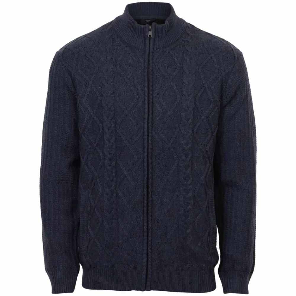Tidløs herre strik cardigan fra Vito. Cardiganen har et fint kabelmønster og en praktisk lynlås. Modellen er foret med et glat og blødt materiale, der giver ekstra komfort og isolering. Perfekt til kølige dage, hvor du ønsker både stil og funktionalitet.